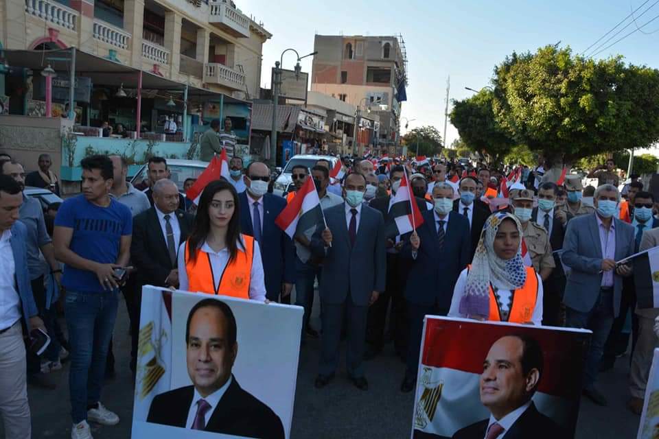 بدأت المسيرة من أمام نادي المنيا الرياضي حتى مبني ديوان عام المحافظة على كورنيش النيل، بمشاركة عدد من القيادات الشعبية والتنفيذية والدينية بالمحافظة، مرددين النشيد الوطني والأغاني الوطنية.
