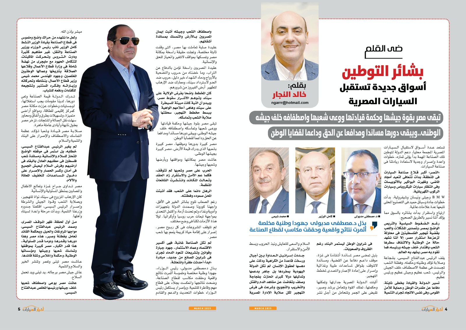 البداية مع مقال الكاتب الصحفي خالد النجار رئيس تحرير "أخبار السيارات" الذي جاء بعنوان "بشائر التوطين أسواق جديدة تستقبل السيارات المصرية"، حيث أكد أن دعم الدولة لتوطين صناعة السيارات بدأ يؤتى ثماره، مع خطوات واعدة وإصرار وجدية لاستعادة ريادتنا فى صناعة السيارات، وأضاف أن «النصر» أكبر قلاع صناعة السيارات فى المنطقة، بدأت تتعافى لتعيد أمجاد الماضي، وظهرت البواكير بالأتوبيسات وفى انتظار سيارات الميكروباص وسيارات الركوب الكهربائية.