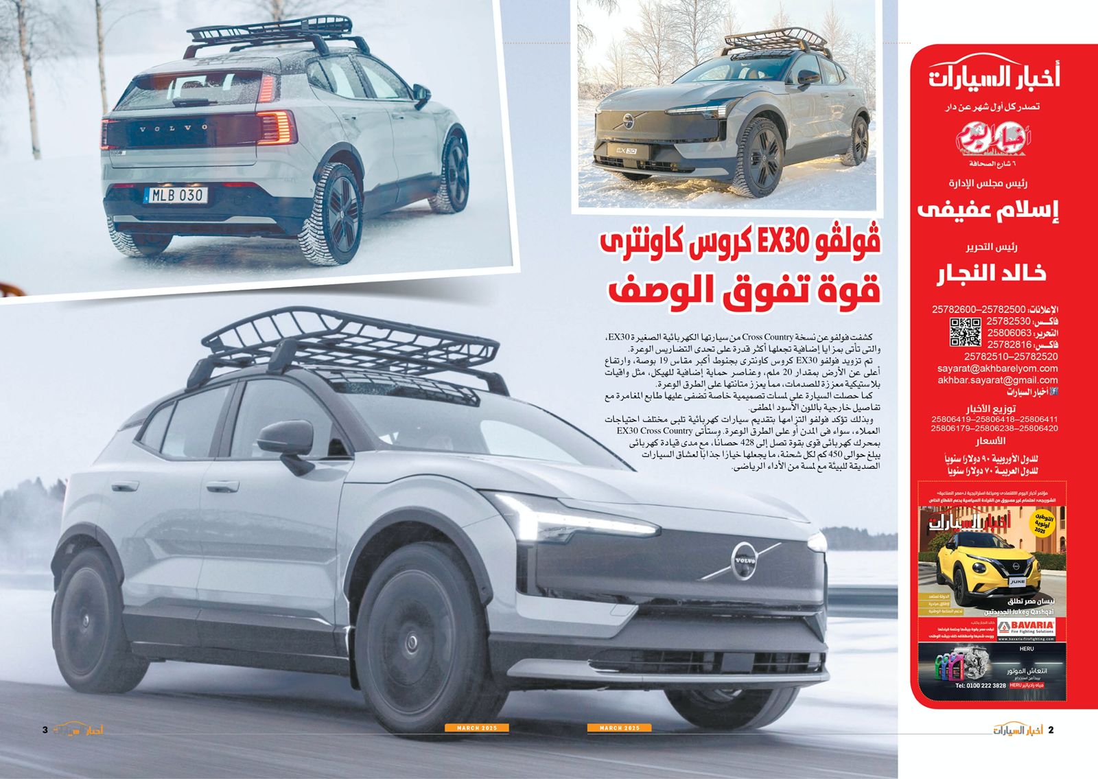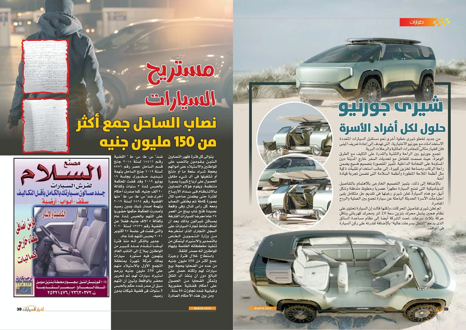 كما ضم العدد تقارير مشوقة إنفنيتي تصل إلى 700 نقطة شحن للسيارات الكهربائية، مرسيدس AMG تصميم تفوق التوقعات، ڤولڤو EX30 كروس كاونترى قوة تفوق الوصف، سبكتر بلاك بادج إبداع جديد من رولز رويس، نيسان مصر تطلق Qashqai و Juke الجديدتين، لامبورچينى جالاردو ريستومود تصميم كلاسيكي بروح عصرية، التوطين أولوية 2025، روشتة أمان خلال الصيام، الحصص الاستيرادية لوكلاء السيارات دعم إضافى للإنتاج المحلى، شاومى SU7 Ultra تتخطى حدود الابتكار، بيع 102 ألف سيارة فى مصر العام الماضي، المنصور للسيارات تطلق أوبل جراند لاند الجديدة المصممة والمصنعة فى ألمانيا، شيري جورنيور حلول لكل افراد الأسرة، مستريح السيارات.. نصاب الساحل جمع أكثر من 150 مليون جنيه.