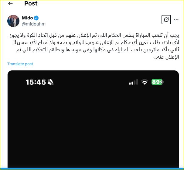 أكد أحمد حسام ميدو، عبر حسابه الرسمي على منصة "إكس"، على ضرورة الالتزام باللوائح والقوانين المتعلقة بتعيين الحكام في المباريات الرسمية.