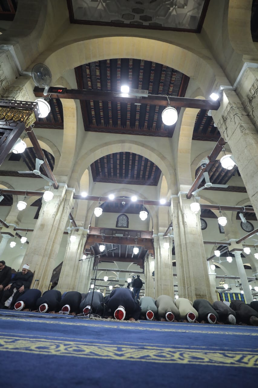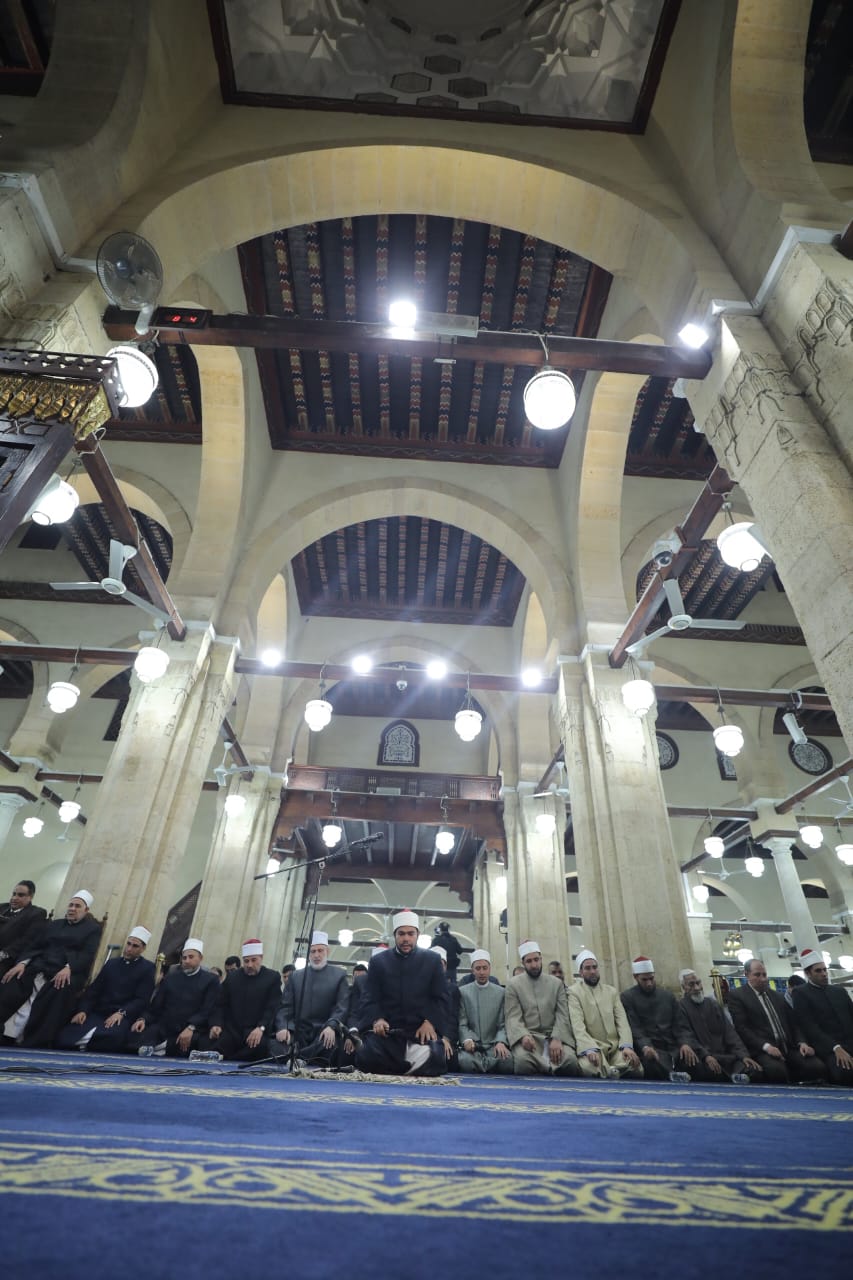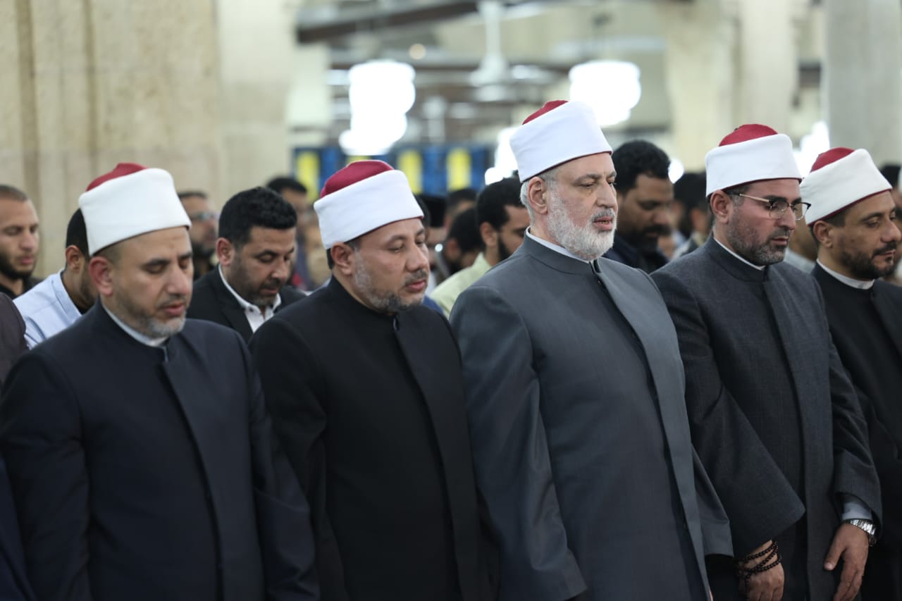 تقدم المصلين وكيل الأزهر الدكتور محمد الضويني، ومدير عام الجامع الأزهر الدكتور هاني عودة، ووكيل لجنة مراجعة المصحف الشيخ حسن عبد النبي، ونخبة من علماء وقيادات الأزهر.