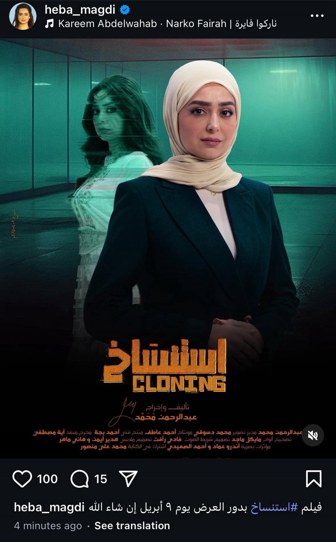 بدأت الفنانة هبة مجدي الترويج لفيلمها الجديد "استنساخ"، والذي من المقرر أن يُعرض في دور السينما يوم 9 أبريل الجاري. ونشرت هبة عبر حساباتها الرسمية البوستر الدعائي للفيلم، تمهيدًا لعرضه خلال أيام، في خطوة تهدف إلى جذب انتباه الجمهور وتشويقهم لمحتوى العمل.