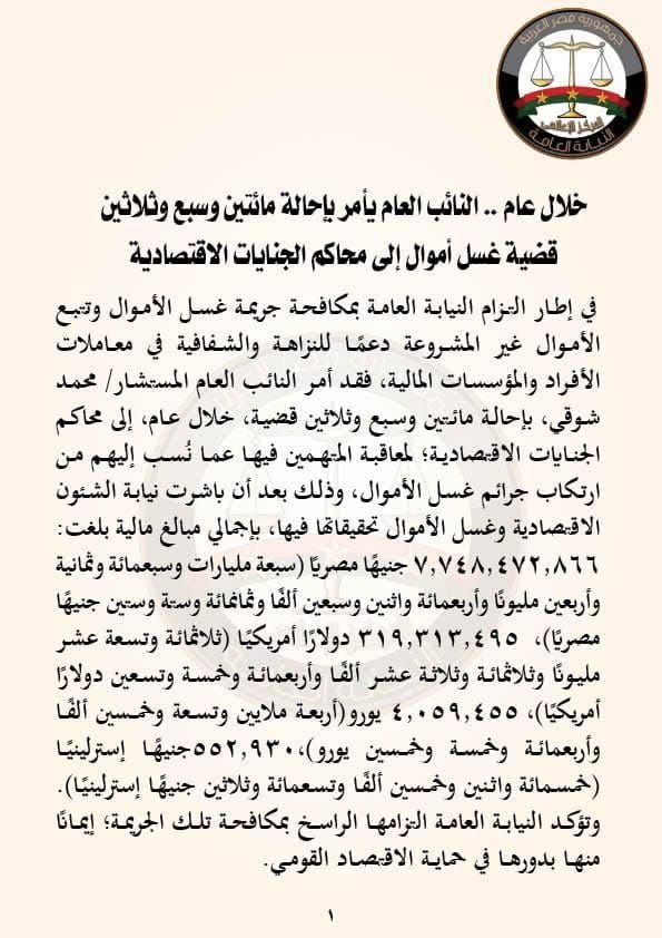 في إطار التزام النيابة العامة بمكافحة جريمة غسل الأموال وتتبع الأموال غير المشروعة دعمًا للنزاهة والشفافية في معاملات الأفراد والمؤسسات المالية، فقد أمر النائب العام المستشار محمد شوقي، بإحالة مائتين وسبع وثلاثين قضية، خلال عام، إلى محاكم الجنايات الاقتصادية؛ لمعاقبة المتهمين فيها عما نُسب إليهم من ارتكاب جرائم غسل الأموال، وذلك بعد أن باشرت نيابة الشئون الاقتصادية وغسل الأموال تحقيقاتها فيها، بإجمالي مبالغ مالية بلغت: 7,748,473,866 جنيهًا مصريًا (سبعة مليارات وسبعمائة وثمانية وأربعين مليونًا وأربعمائة واثنين وسبعين ألفًا وثمانمائة وستة وستين جنيهًا مصريًا)، 319,313,495 دولارًا أمريكيًا (ثلاثمائة وتسعة عشر مليونًا وثلاثمائة وثلاثة عشر ألفًا وأربعمائة وخمسة وتسعين دولارًا أمريكيًا)، 4,059,445 يورو (أربعة ملايين وتسعة وخمسين ألفًا وأربعمائة وخمسة وخمسين يورو)، 552,930 جنيهًا إسترلينيًا (خمسمائة واثنين وخمسين ألفًا وتسعمائة وثلاثين جنيهًا إسترلينيًا).