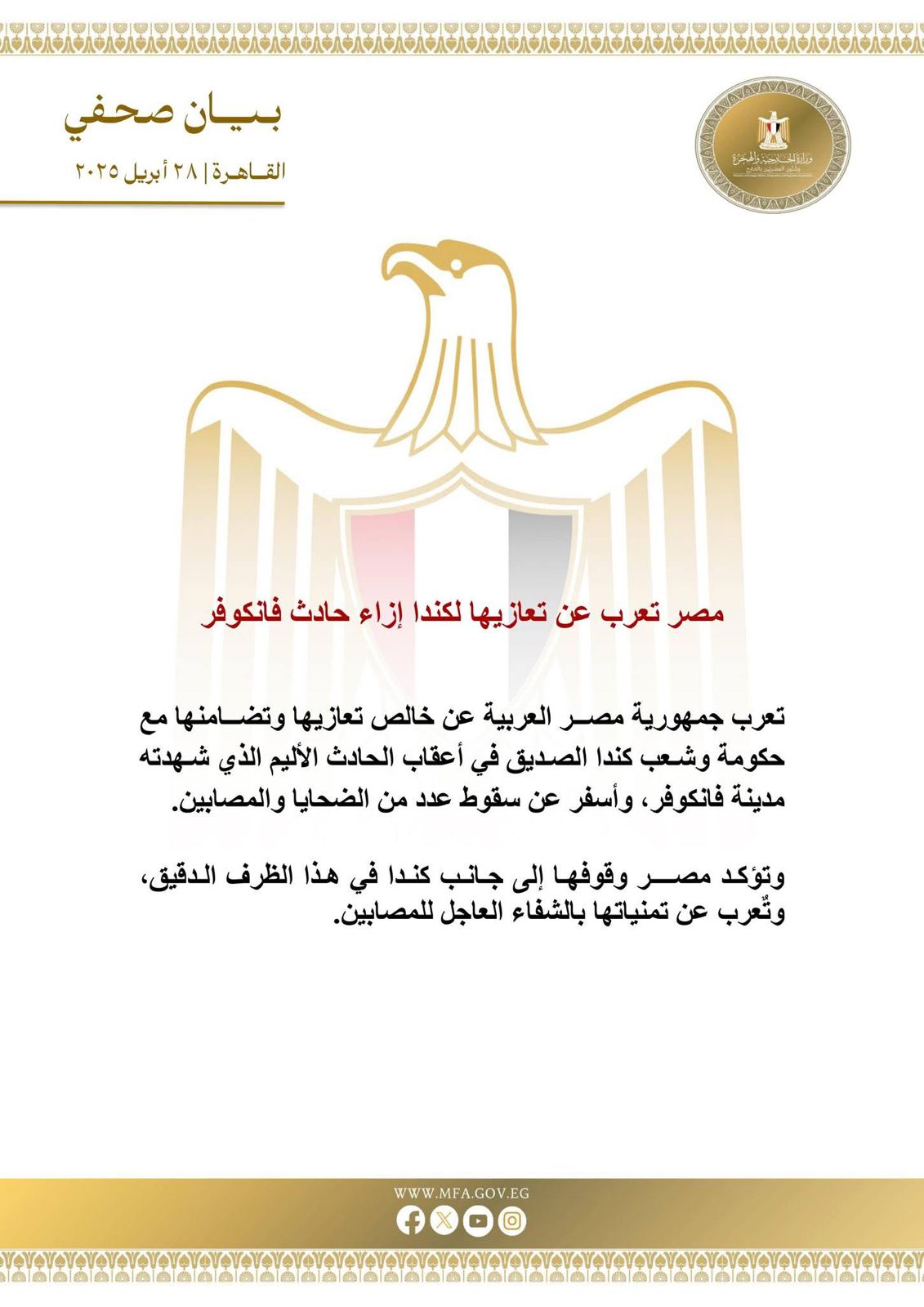 أعربت مصر عن خالص تعازيها وتضامنها مع حكومة وشعب كندا الصديق في أعقاب الحادث الأليم الذي شهدته مدينة فانكوفر، وأسفر عن سقوط عدد من الضحايا والمصابين.