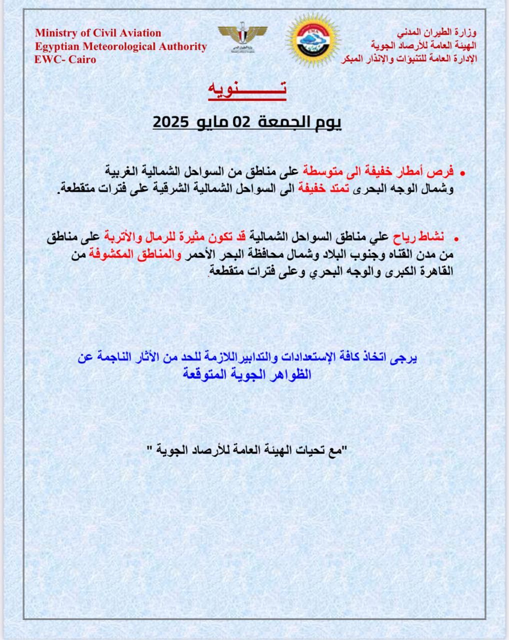 فرص أمطار خفيفة إلى متوسطة على مناطق من السواحل الشمالية الغربية وشمال الوجه البحري، تمتد خفيفة إلى مناطق من السواحل الشمالية الشرقية.