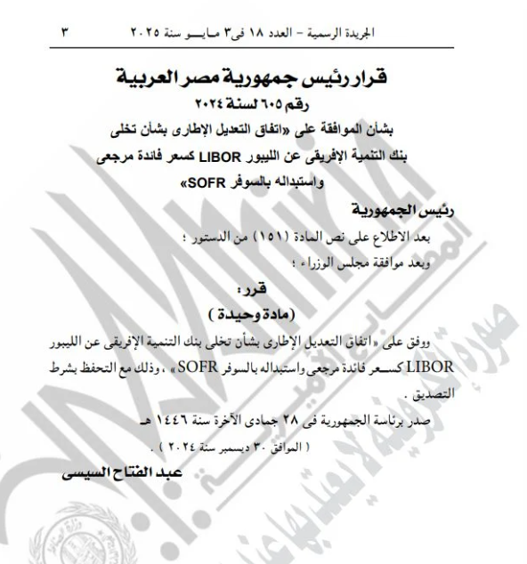 نشرت الجريدة الرسمية في عددها الصادر اليوم الاحد قرار رئيس الجمهورية رقم ٦٠٥ لسنة ٢٠٢٤ بشأن الموافقة على اتفاق التعديل الإطاري بشأن تخلى بنك التنمية الأفريقي عن الليبور كسعر فائدة مرجعي واستبداله بالسوفر.