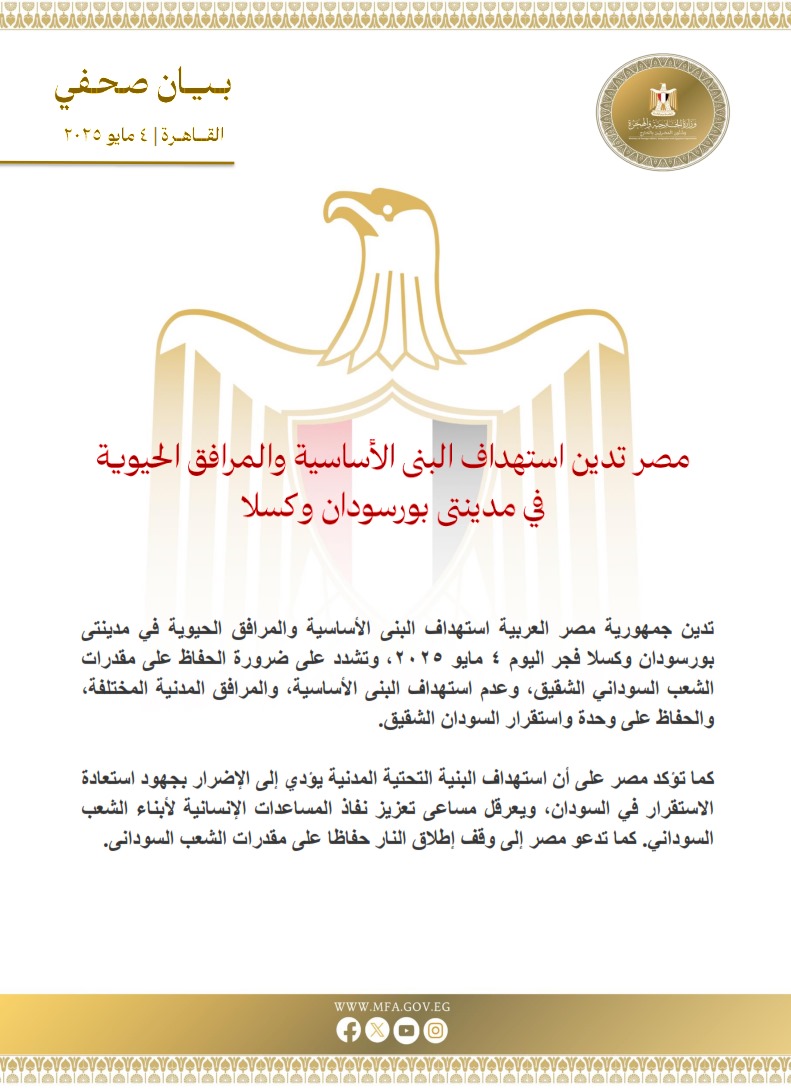 أدانت جمهورية مصر العربية، صباح اليوم الأحد الموافق 4 مايو 2025، استهداف البنى الأساسية والمرافق الحيوية في مدينتي بورسودان وكسلا السودانيّتين. وأعربت مصر عن بالغ قلقها إزاء هذه التطورات التي تمثل تهديدًا مباشرًا لمقدرات الشعب السوداني الشقيق.