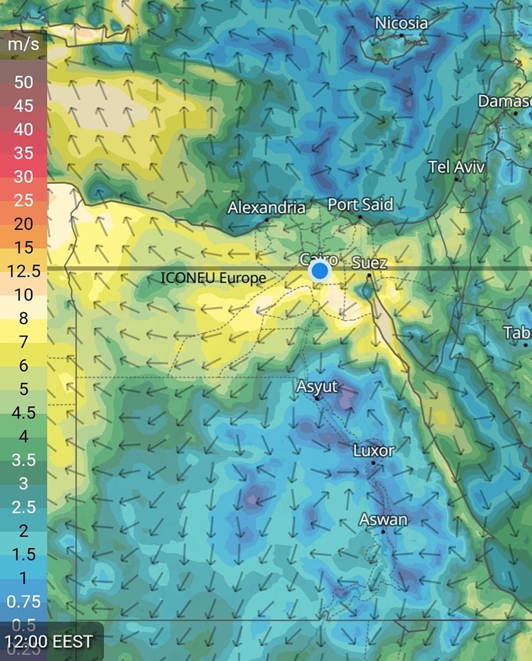 وبالنسبة لحالة البحر المتوسط فتكون خفيفة إلى معتدلة، وارتفاع الموج من (1 - 1.5) متر، واتجاه الرياح شمالية شرقية: جنوبية شرقية.