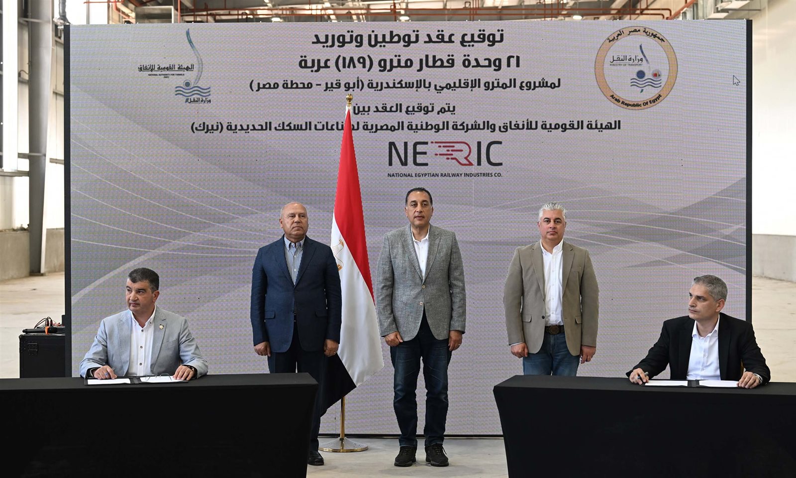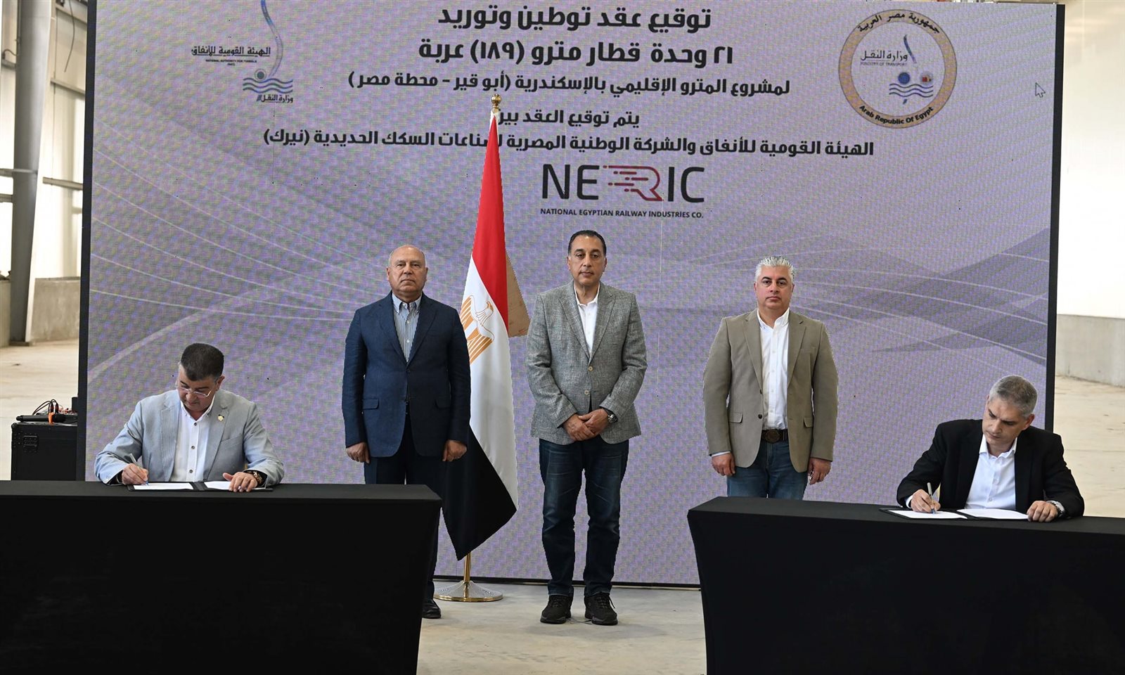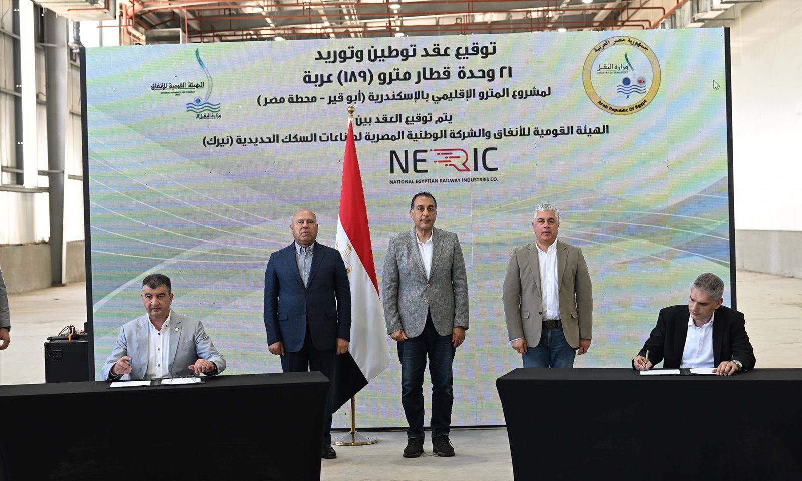 شهد الدكتور مصطفى مدبولي، رئيس مجلس الوزراء، خلال زيارته مصنع نيرك لصناعات السكك الحديدية (نيرك) بشرق بورسعيد، اليوم السبت، مراسم توقيع اتفاقية عقد توطين وتوريد 21 وحدة قطار مترو، بواقع 189 عربة لصالح مشروع مترو الإسكندرية (أبو قير - محطة مصر).