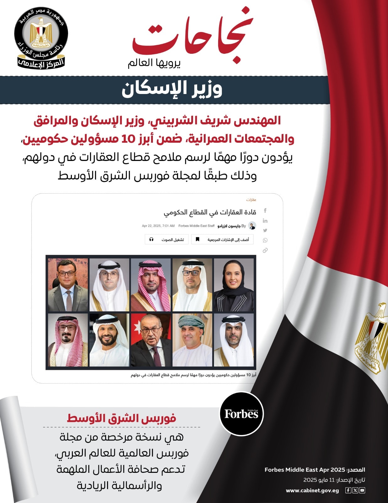 اختير المهندس شريف الشربيني، وزير الإسكان، ضمن قائمة أبرز القادة الحكوميين المؤثرين في قطاع العقارات على المستوى الإقليمي يؤكد على المكانة المتقدمة التي حققتها مصر في تطوير البنية التحتية والمجتمعات العمرانية، ويعكس التقدير الدولي لجهود الدولة في تحقيق نهضة عمرانية شاملة ومستدامة، وقد جاء ذلك بالتوازي مع عدد من الإنجازات المهمة، من بينها مبادرة "بيتك في مصر" وتوقيع مذكرة تفاهم مع جهاز مستقبل مصر لتأسيس شركة Modon.