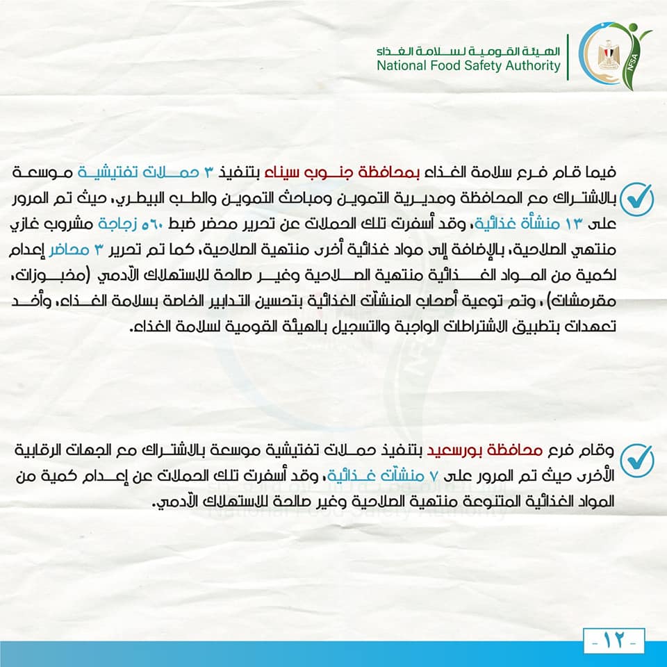 ونفذ مفتشو إدارة الشكاوى حملات على 144 منشأة غذائية للتأكد من سلامة المنتجات الغذائية المعروضة في محافظات الغربية، الدقهلية، كفر الشيخ، الغردقة، الوادي الجديد وبور سعيد، مع اتخاذ كافة الإجراءات التصحيحية اللازمة في حالة وجود أية ملاحظات متعلقة باشتراطات سلامة الغذاء.