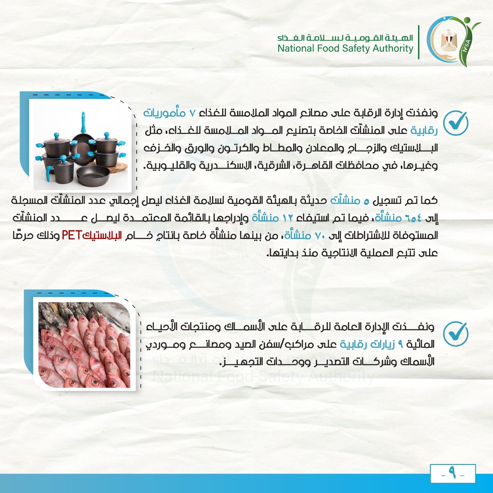 ونفذت إدارة الرقابة على مصانع المواد الملامسة للغذاء 7 مأموريات رقابية على المنشآت الخاصة بتصنيع المواد الملامسة للغذاء، مثل البلاستيك والزجاج والمعادن والمطاط والكرتون والورق والخزف وغيرها، في محافظات القاهرة، الشرقية، الاسكندرية والقليوبية.