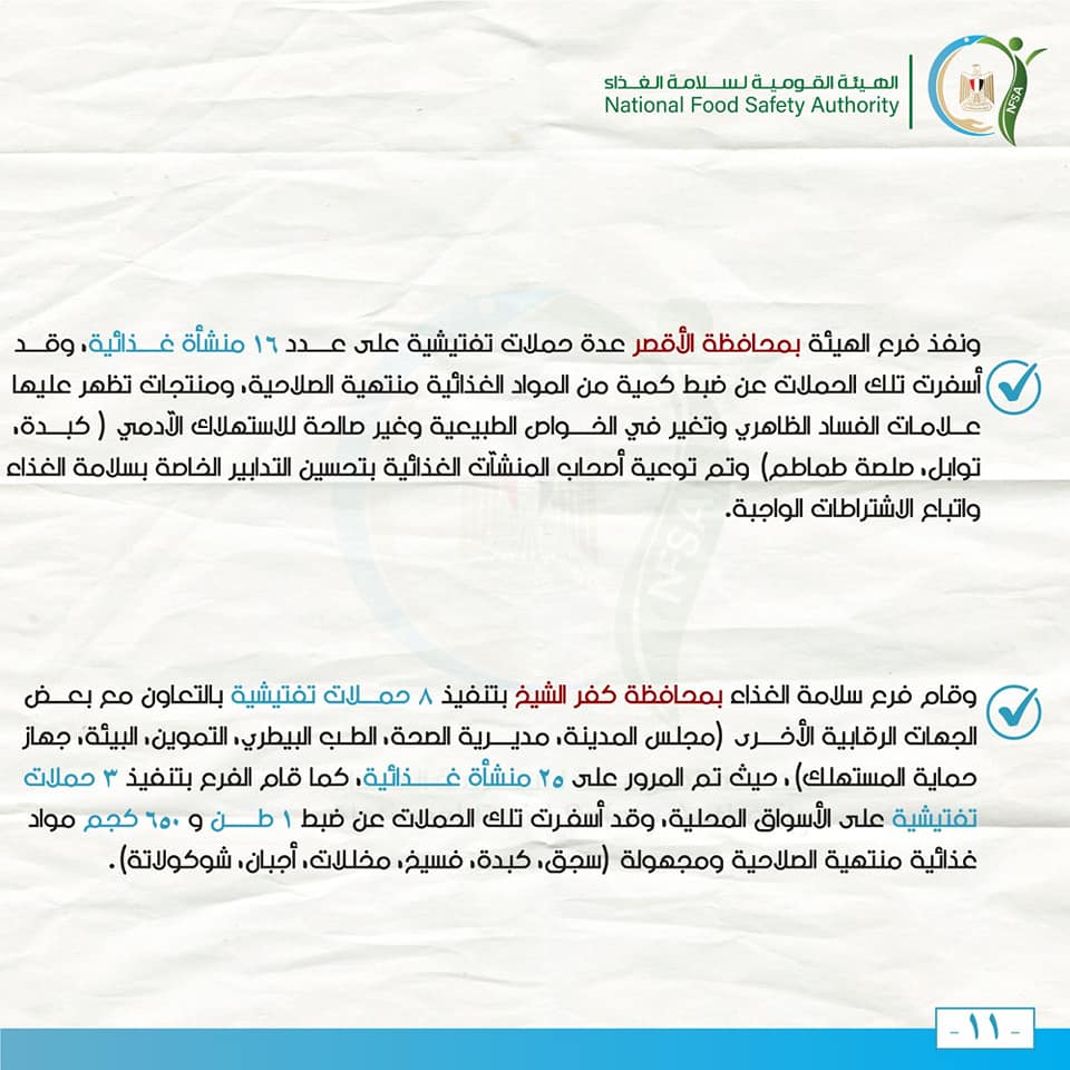 وقام فرع سلامة الغذاء بمحافظة كفر الشيخ بتنفيذ 8 حملات تفتيشية بالتعاون مع بعض الجهات الرقابية الأخرى (مجلس المدينة، مديرية الصحة، الطب البيطري، التموين، البيئة، جهاز حماية المستهلك)، حيث تم المرور على 25 منشأة غذائية، كما قام الفرع بتنفيذ 3 حملات تفتيشية على الأسواق المحلية، وقد أسفرت تلك الحملات عن ضبط 1 طن و 650 كجم مواد غذائية منتهية الصلاحية ومجهولة (سجق، كبدة، فسيخ، مخللات، أجبان، شوكولاتة).