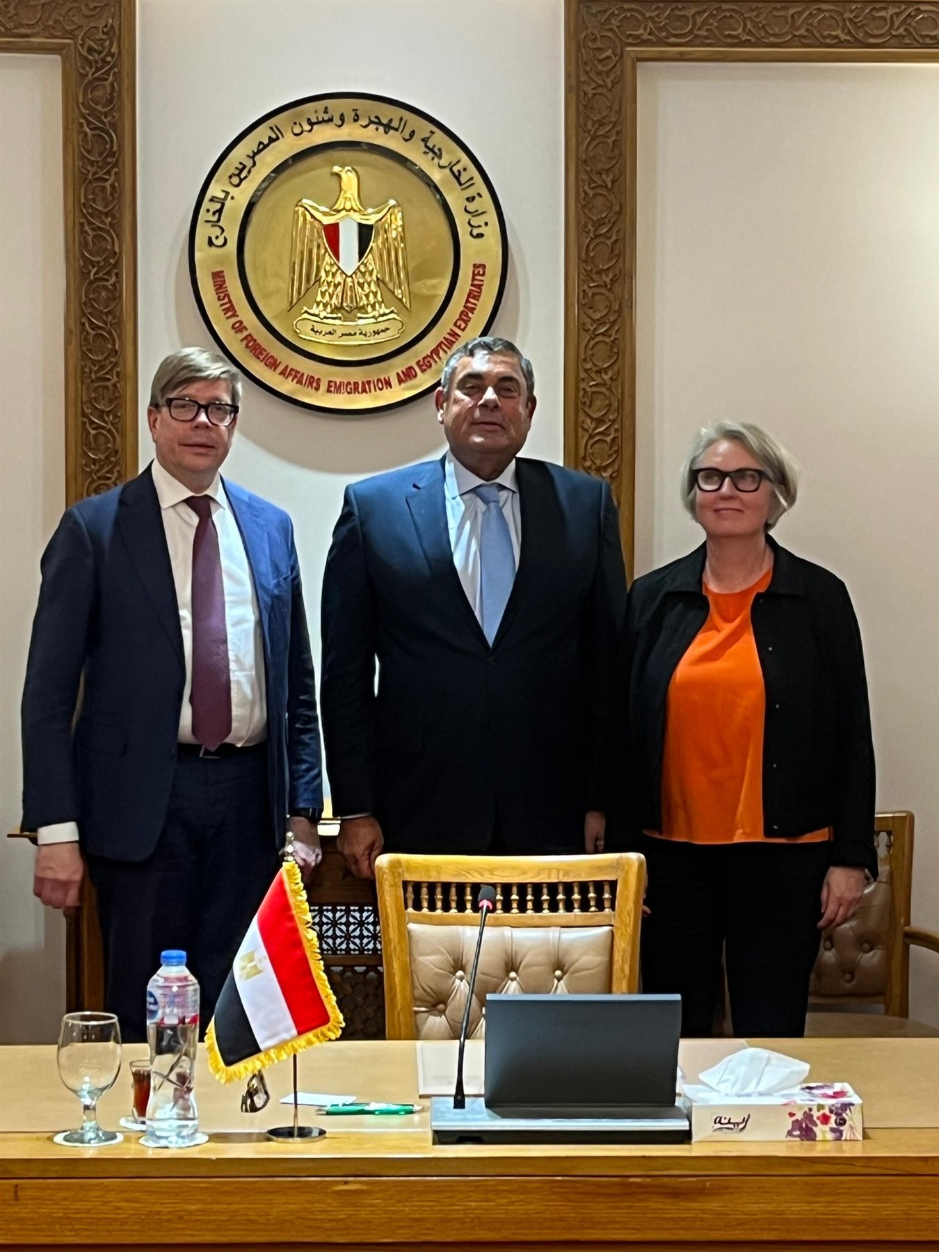 استقبل السفير أبو بكر حفني محمود، نائب وزير الخارجية للهجرة وشؤون المصريين في الخارج، السكرتير الدائم بوزارة خارجية فنلندا، "يوكا سالوفارا" يوم الثلاثاء ١٣ مايو على هامش جولة المشاورات السياسية بين مصر وفنلندا، لبحث سُبل تعزيز العلاقات الثنائية بين البلدين، والتعاون في مجال التجارة والاستثمار، فضلاً عن التنسيق بين البلدين في المحافل الإقليمية والدولية متعددة الأطراف.