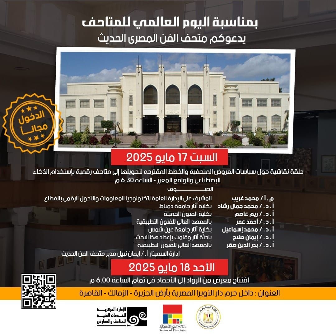 بينما تُقام في متحف مصطفى كامل ندوة ثقافية بعنوان “المتاحف الخضراء .. مستقبل مستدام لحفظ التراث” تناقش مفاهيم الاستدامة في العمل المتحفي. ويشهد متحف زكريا الخناني وعايدة عبد الكريم ورشة حكي موجهة للفئة العمرية من 12 إلى 18 سنة، تتناول سيرة الفنانين زكريا الخناني وعايدة عبد الكريم. أما متحف محمد ناجي فيستضيف معرض نتاج ورش اليوم الواحد، يصاحبه ندوة بعنوان “مدارسنا.. في متاحفنا”، تبدأ في تمام الساعة 11 صباحًا. وتُقام في متحف الفنون الجميلة بالإسكندرية ندوة تعريفية يعقبها ورش رسم وتلوين موجهة لجميع الأعمار، من الساعة 11 صباحًا حتى 3 عصرًا. ويُختتم اليوم في متحف الفن المصري الحديث بحلقة نقاشية تُعقد في تمام الساعة 6:30 مساءً، حول “سياسات العروض المتحفية والخطط المقترحة لتحويلها إلى متاحف رقمية باستخدام الذكاء الاصطناعي والواقع المعزز”.