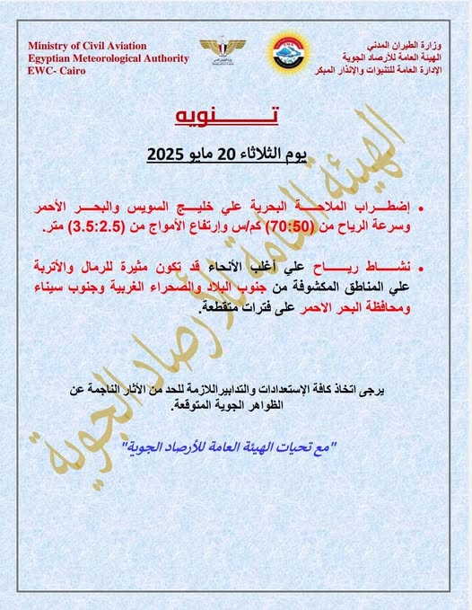 يتوقع خبراء الهيئة العامة للأرصاد الجوية، أن يشهد غدا الثلاثاء 20- 5- 2025، طقس حار نهارًا على القاهرة الكبرى والوجه البحري وشمال الصعيد، شديد الحرارة على جنوب سيناء وجنوب البلاد، مائل للحرارة على السواحل الشمالية، معتدل الحرارة ليلاً على أغلب الأنحاء.