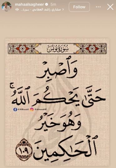 ونشرت مها الصغير «ستوري» عبر حسابها على موقع إنستجرام «آية من سورة يونس»، بصوت الشيخ مشاري راشد العفاسى، وهى: «واصبر حتى يحكم الله وهو خير الحاكمين».