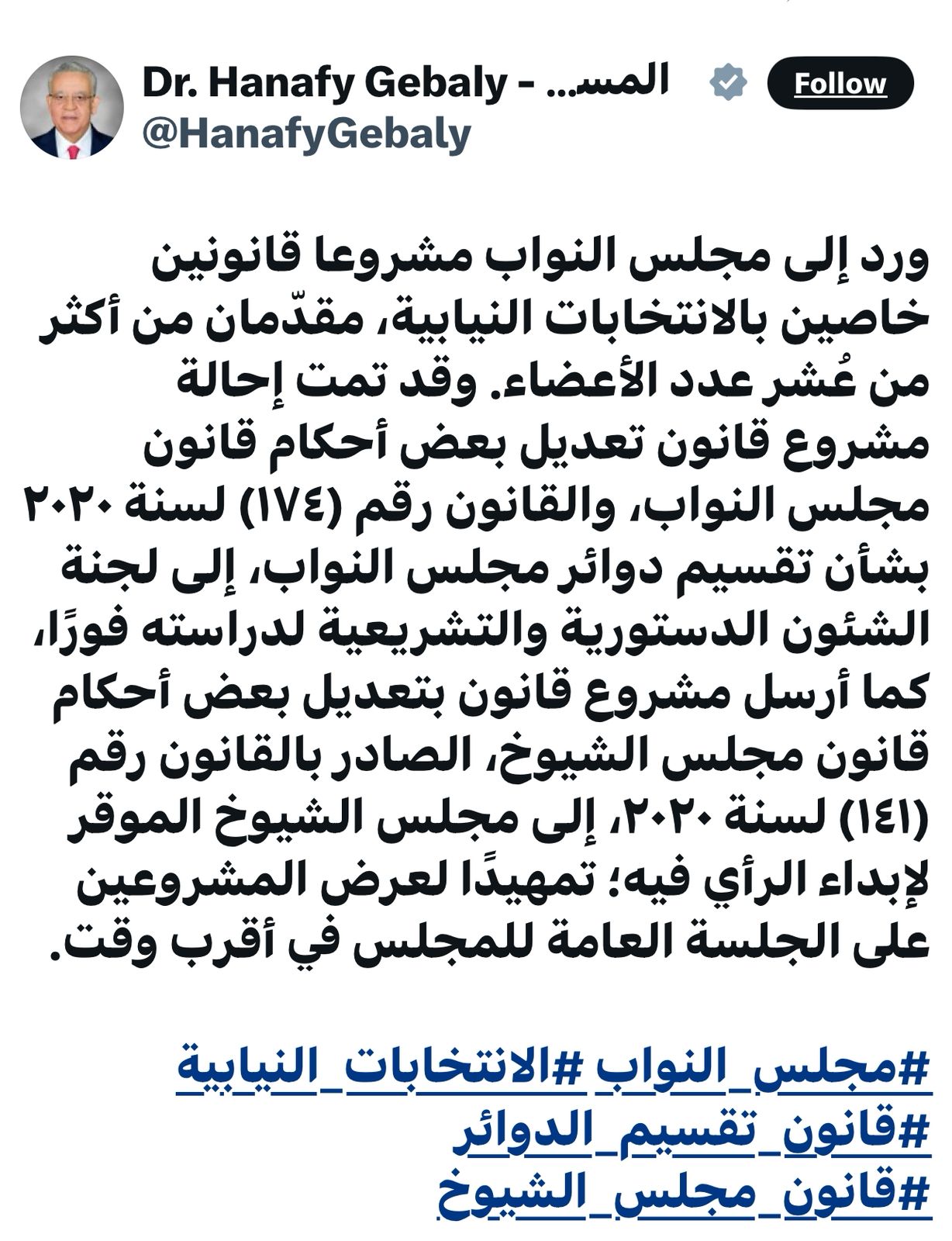 وأضاف المستشار الدكتور حنفي جبالي، في منشور له على موقع التواصل الاجتماعي «إكس»، أنه تمت إحالة مشروع قانون تعديل بعض أحكام قانون مجلس النواب، والقانون رقم (١٧٤) لسنة ٢٠٢٠ بشأن تقسيم دوائر مجلس النواب، إلى لجنة الشئون الدستورية والتشريعية لدراسته فورًا.