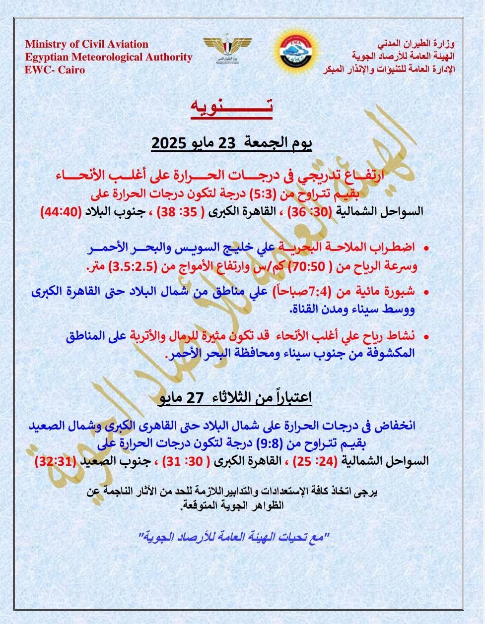 وتنشط رياح على السواحل الشرقية والقاهرة الكبرى وجنوب البلاد، قد تكون مثيرة للرمال والأتربة على المناطق المكشوفة من جنوب سيناء ومحافظة البحر الأحمر على فترات متقطعة.