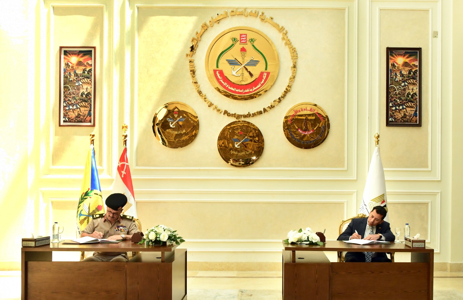 وقع كل من الدكتور أشرف صبحي وزير الشباب والرياضة واللواء أ ح عاطف عبد الرؤوف محمود مدير الأكاديمية العسكرية للدراسات العليا والاستراتيجية بروتوكول تعاون وذلك لتعزيز التقارب بين الشباب والقيادات الوطنية والمساهمة في إعداد جيل واعٍ بقضايا الأمن القومي، وذلك في إطار حرص القيادة العامة للقوات المسلحة على تعزيز الوعي لدى الشباب المصري وتأهيل كوادر جديدة قادرة على خدمة الوطن في شتى المجالات.