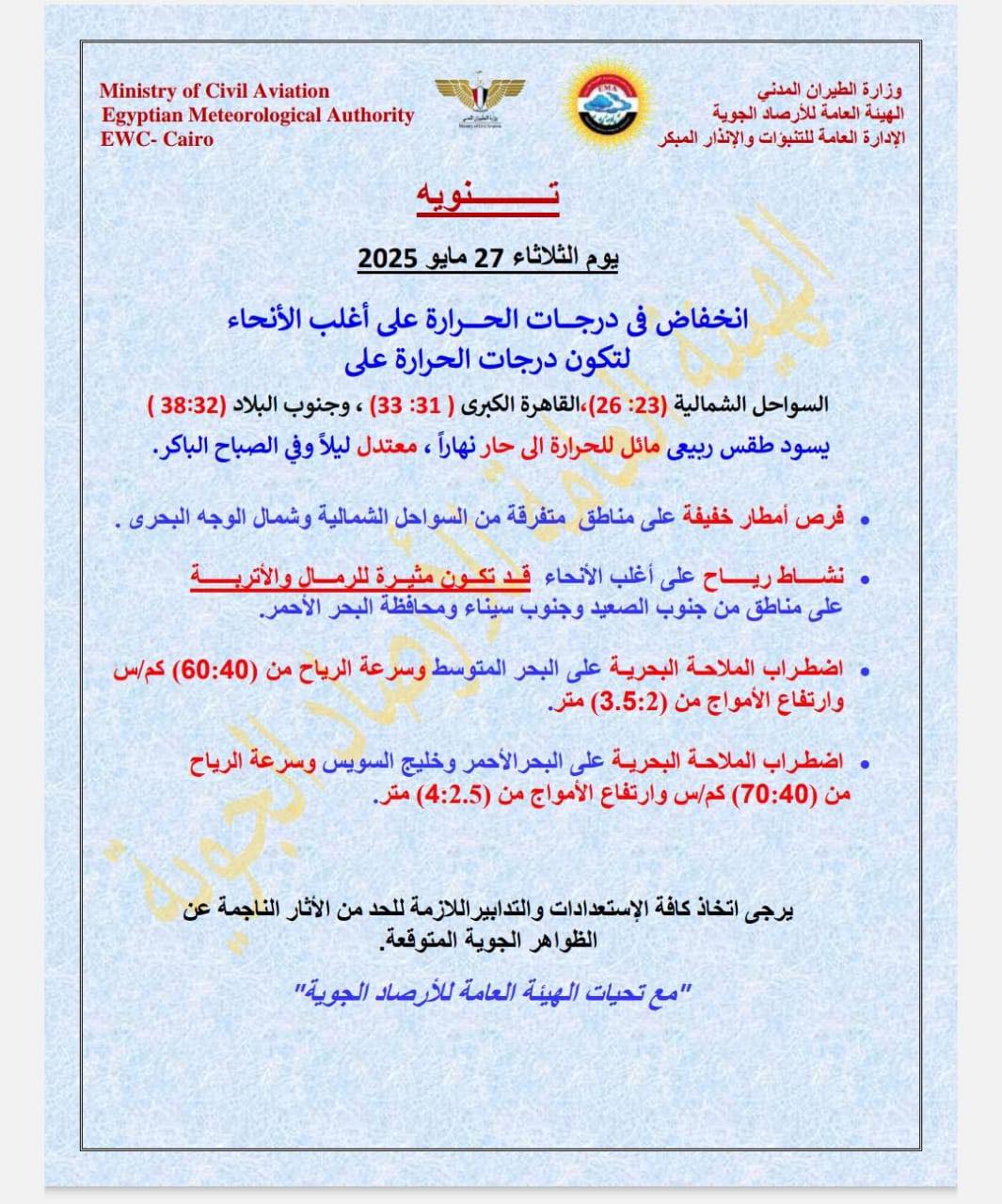 بالإضافة إلى نشاط رياح على أغلب المناطق قد تكون مثيرة للرمال والأتربة على مناطق من جنوب الصعيد وجنوب سيناء ومحافظة البحر الأحمر.