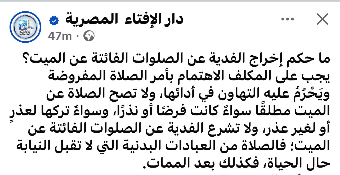 الإفتاء ترد على حكم إخراج الفدية عن الصلوات الفائتة عن الميت
