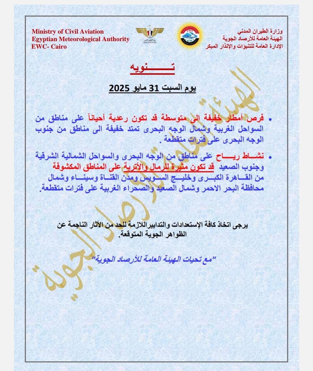 وتنشط رياح على مناطق من الوجه البحري والسواحل الشمالية الشرقية وجنوب الصعيد، قد تكون مثيرة للرمال والأتربة على المناطق المكشوفة من القاهرة الكبرى وخليج السويس ومدن القناة وسيناء وشمال محافظة البحر الأحمر وشمال الصعيد والصحراء الغربية على فترات متقطعة.