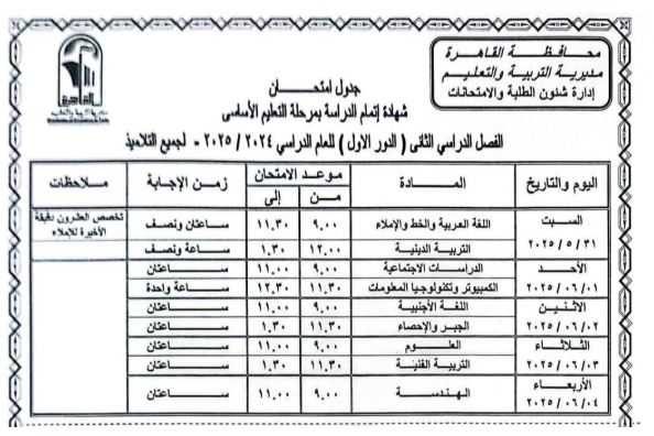وكشفت مديرية التربية والتعليم بالقاهرة جدول امتحانات الشهادة الإعدادية على النحو التالي: