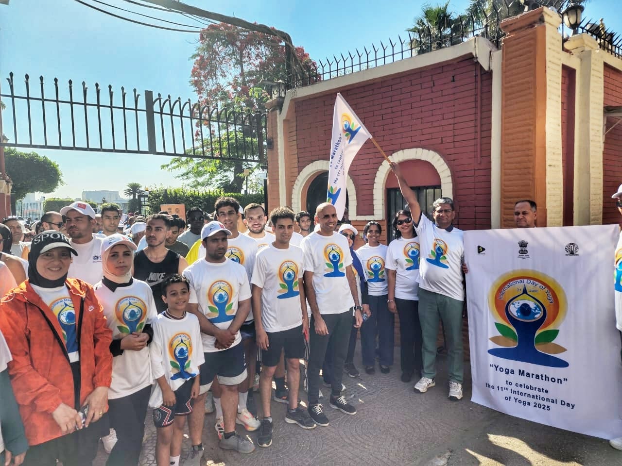في إطار الاستعدادات للاحتفال باليوم العالمي الحادي عشر لليوجا، نظمت سفارة الهند بالقاهرة، بالتعاون مع فريق "هابي رانرز إيجيبت"، بنجاح فعالية ماراثون اليوجا يوم 30 مايو 2025. أقيمت الفعالية في قلب القاهرة وشهدت مشاركة حماسية لما يقرب من 300 شخص من الشباب وممارسي اليوجا والمهتمين باللياقة البدنية.