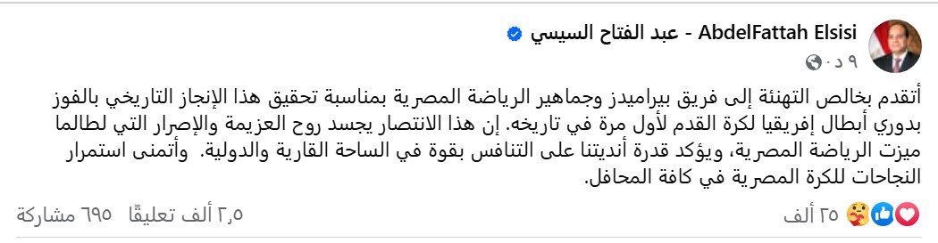 "أتقدم بخالص التهنئة إلى فريق بيراميدز وجماهير الرياضة المصرية بمناسبة تحقيق هذا الإنجاز التاريخي بالفوز بدوري أبطال إفريقيا لكرة القدم لأول مرة في تاريخه."