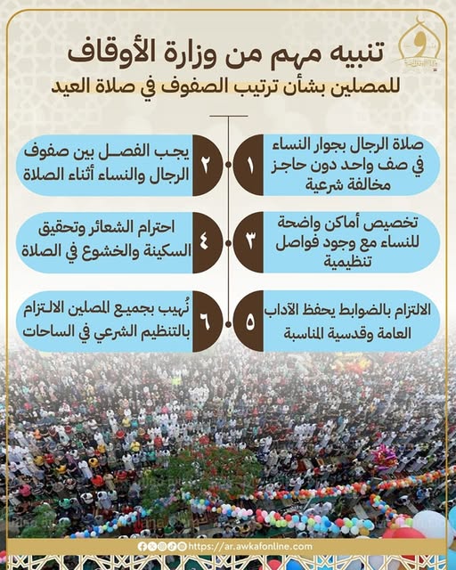 وختمت الوزارة: "لذا نهيب بجميع المصلين والمصليات، ضرورة الانتباه إلى هذه المسألة، وتنظيم الصفوف بما يتوافق مع الشرع الشريف، وذلك من خلال تخصيص أماكن واضحة للنساء، تفصلها عن صفوف الرجال بحواجز مناسبة أو فواصل تنظيمية، تضمن أداء الصلاة في أجواء روحانية تليق بمقام العيد المبارك".