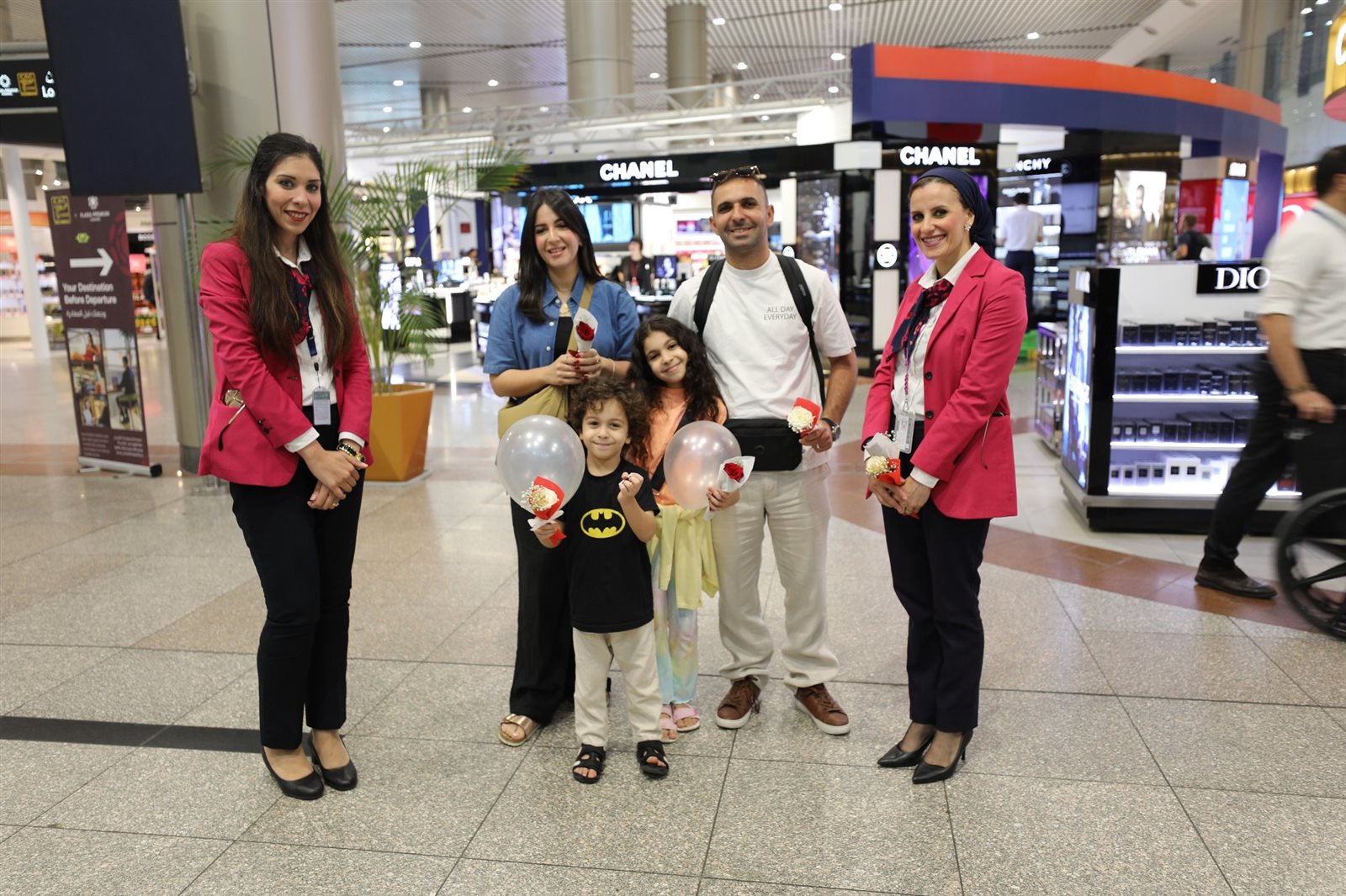 وقام فريق من إدارة العلاقات العامة والمراسم بتهنئة الركاب بحلول عيد الأضحى المبارك، ومشاركتهم مظاهر الاحتفال من خلال توزيع الورود والشيكولاتة، وتبادل التهاني مع المسافرين.