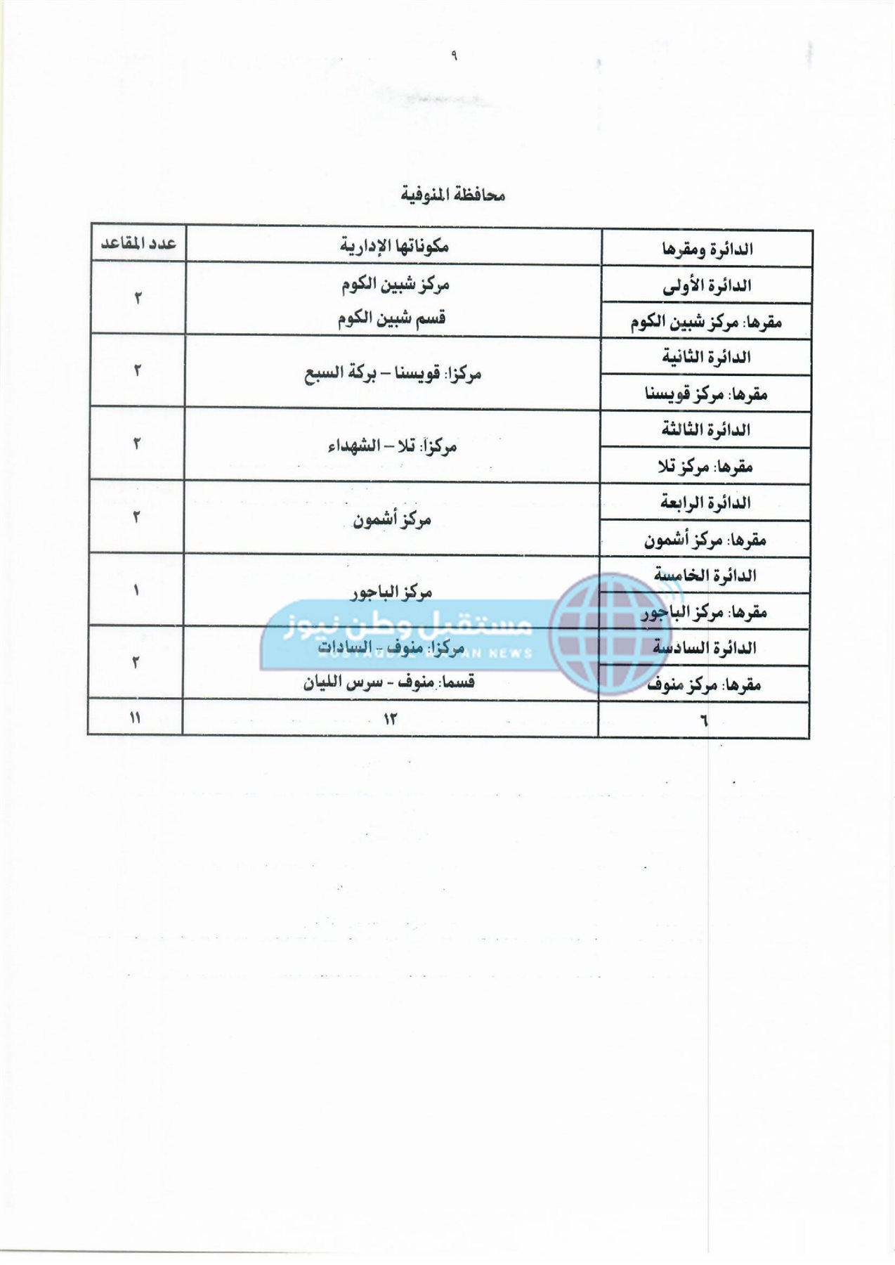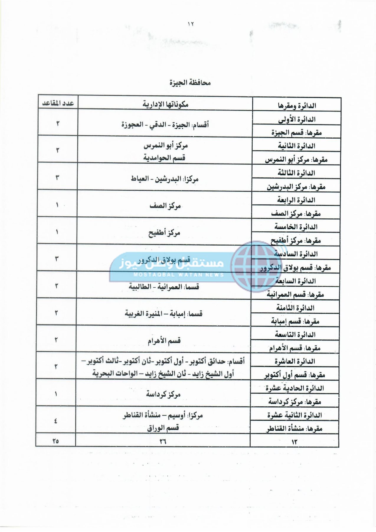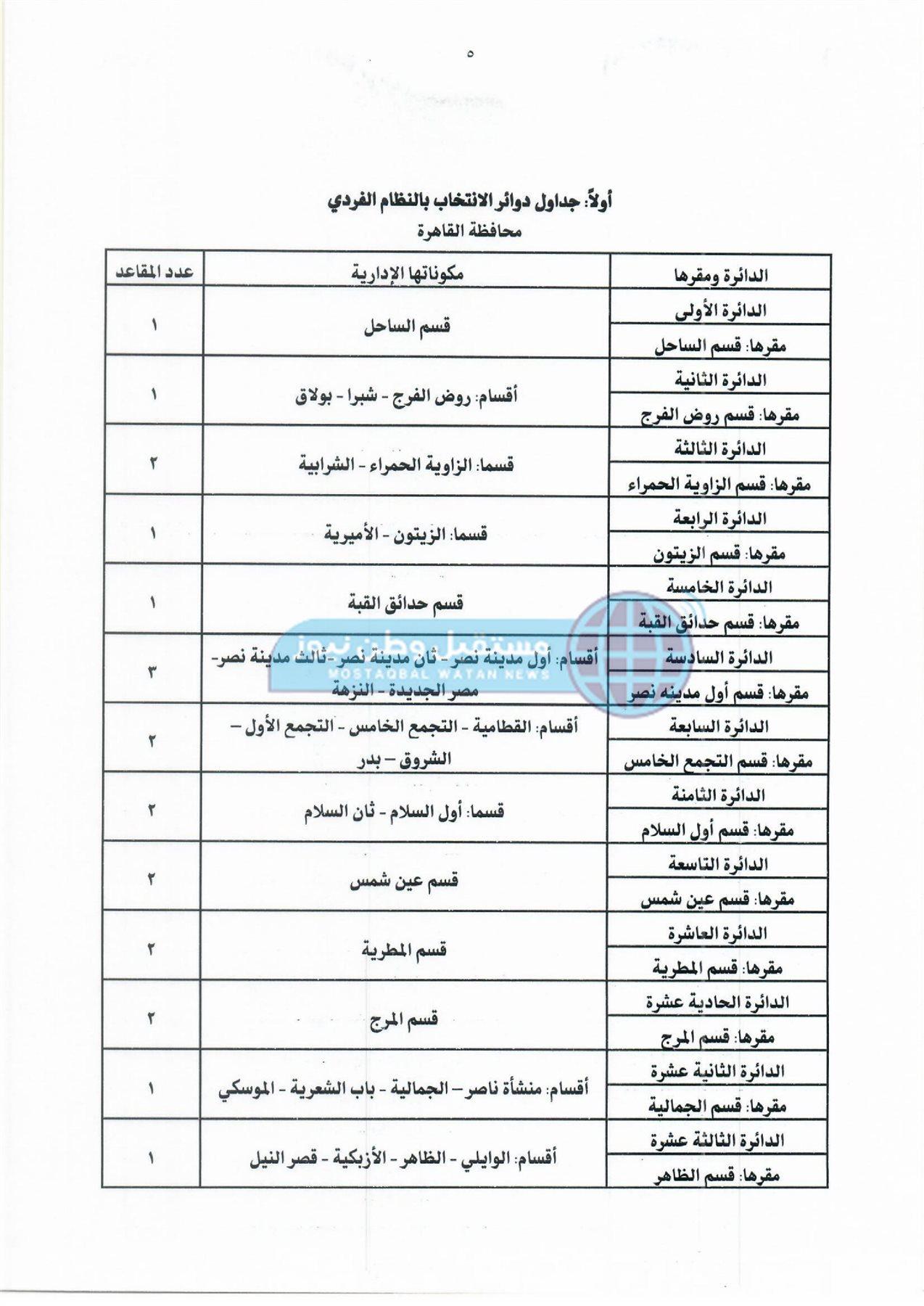 أولًا: جداول دوائر وعدد مقاعد نظام الفردي لمجلس النواب بكل محافظة