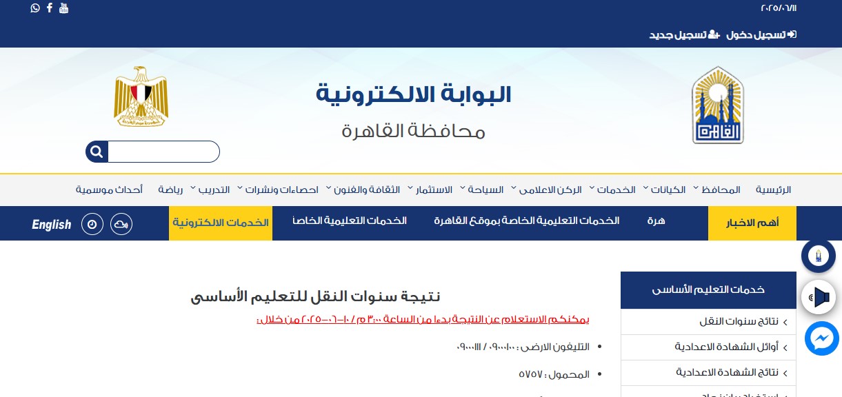 كما أتاحت محافظة القاهرة رابط نتيجة سنوات النقل للتعليم الأساسي عبر بوابة التعليم الأساسي ، ومنها نتيجة الصف السادس الابتدائي برقم الجلوس ، على موقع المحافظة.