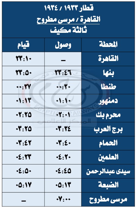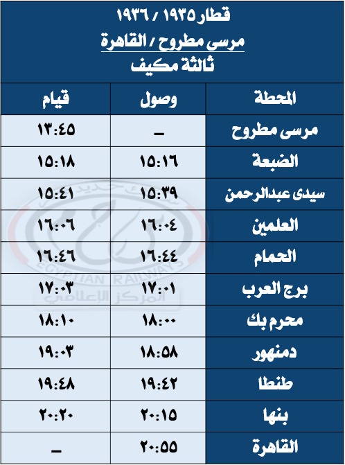 واعتبارًا من يوم الأحد الموافق 15 / 6 / 2025 يتم تشغيل قطار 1935 / 1936 ( ثالثة مكيفة ) مرسى مطروح / القاهرة يومياً ولحين صدور تعليمات أخرى حيث يقوم من محطة مرسى مطروح الساعة 45: 13 ويصل محطة القاهرة الساعة 55: 20 طبقاً للجدول المرفق .