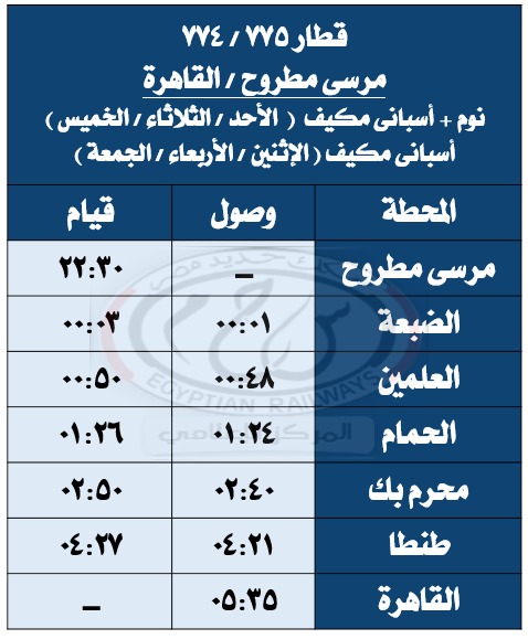 واعتبارًا من يوم الأحد الموافق 22 / 6 / 2025 يتم تشغيل قطار 775 / 774 ( نوم + تانية أسبانى مكيف ) مرسى مطروح / القاهرة أيام ( الأحد / الثلاثاء / الخميس ) من كل أسبوع لحين صدور تعليمات أخرى حيث يقوم من محطة مرسى مطروح الساعة 22:30 ويصل محطة القاهرة الساعة 05:35 صباح اليوم التالى طبقاً للجدول المرفق .