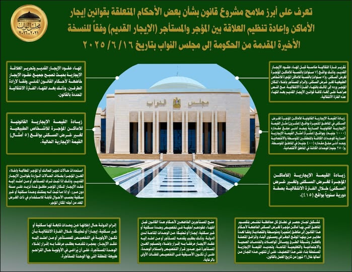 نشرت الصفحة الرسمية لمجلس النواب، عبر موقع التواصل الاجتماعي "فيس بوك"، منذ قليل، أبرز ملامح مشروع قانون بشأن بعض الأحكام المتعلقة بقوانين إيجار الأماكن وإعادة تنظيم العلاقة بين المؤجر والمستأجر (الإيجار القديم) وفقاً للنسخة الأخيرة المقدمة من الحكومة إلى مجلس النواب بتاريخ ١٦/ ٦/ ٢٠٢٥.