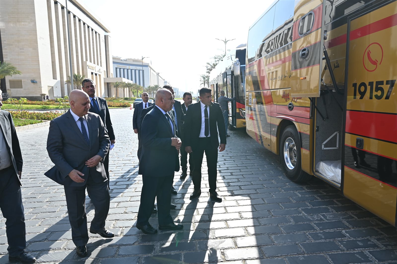 تفقد الفريق مهندس كامل الوزير نائب رئيس مجلس الوزراء للتنمية الصناعية وزير الصناعة والنقل بحضور اللواء ماجد عبد الحميد نائب وزير النقل للنقل البري والمهندس ضياء مصطفى رئيس جهاز تنظيم النقل البري الداخلي والدولي واللواء حسن الليثي رئيس مجلس إدارة شركة الاتحاد العربي للنقل البري سوبرجيت واللواء/ صبري عبد اللطيف رئيس شركة اكتا عدد 20 حافلة مرسيدس جديدة مكيفة الهواء mcv 600 سوبر هاي ديك مجهزة بالكامل تم انتاجها محليا بالشركة المصرية لصناعة وسائل النقل MCV المصرية الوطنية المتخصصة في صناعة الاتوبيسات .