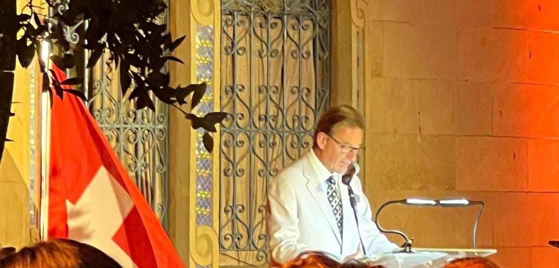 وقال سفير سويسرا: "نحن ملتزمون بالعمل يدًا بيد، ولكن حتى بعد 90 عامًا من الصداقة، تُذكرنا الأحداث بأن التاريخ يحمل في طياته التقدم والألم، والمعاناة البشرية، والصراعات، وانتهاكات القانون الدولي – كما نشهد اليوم – تمثل تحديًا مشتركًا لنا جميعًا."