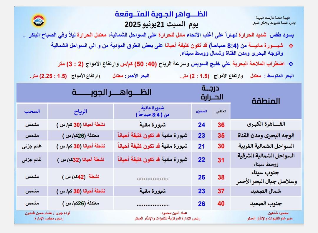 وتوقعت الأرصاد الجوية، أن يكون طقس السبت 21 يونيو شديد الحرارة نهارًا على القاهرة الكبرى والوجه البحري وجنوب سيناء وجنوب البلاد، مائل للحرارة على السواحل الشمالية، فيما يكون الطقس معتدلًا خلال ساعات الليل على أغلب الأنحاء.