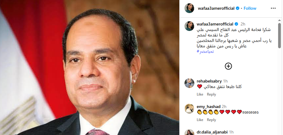ونشرت الفنانة وفاء عامر من خلال حسابها على موقع انستجرام أمس، قائلة: «شكراً فخامة الرئيس على كل ما تقدمه لمصر، يا رب احمي مصر و شعبها برجالنا المخلصين».