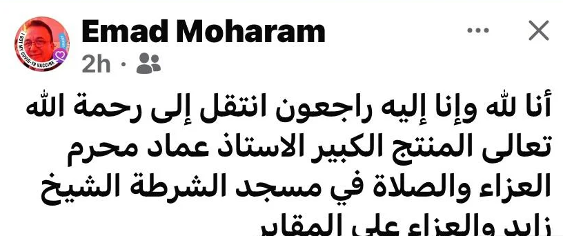 وكتب حساب عماد محرم على موقع فيس بوك: "إنا لله وإنا إليه راجعون، انتقل إلى رحمة الله تعالى المنتج الكبير الأستاذ عماد محرم، العزاة والصلاة فى مسجد الشرطة الشيخ زايد، والعزاء على المقابر".