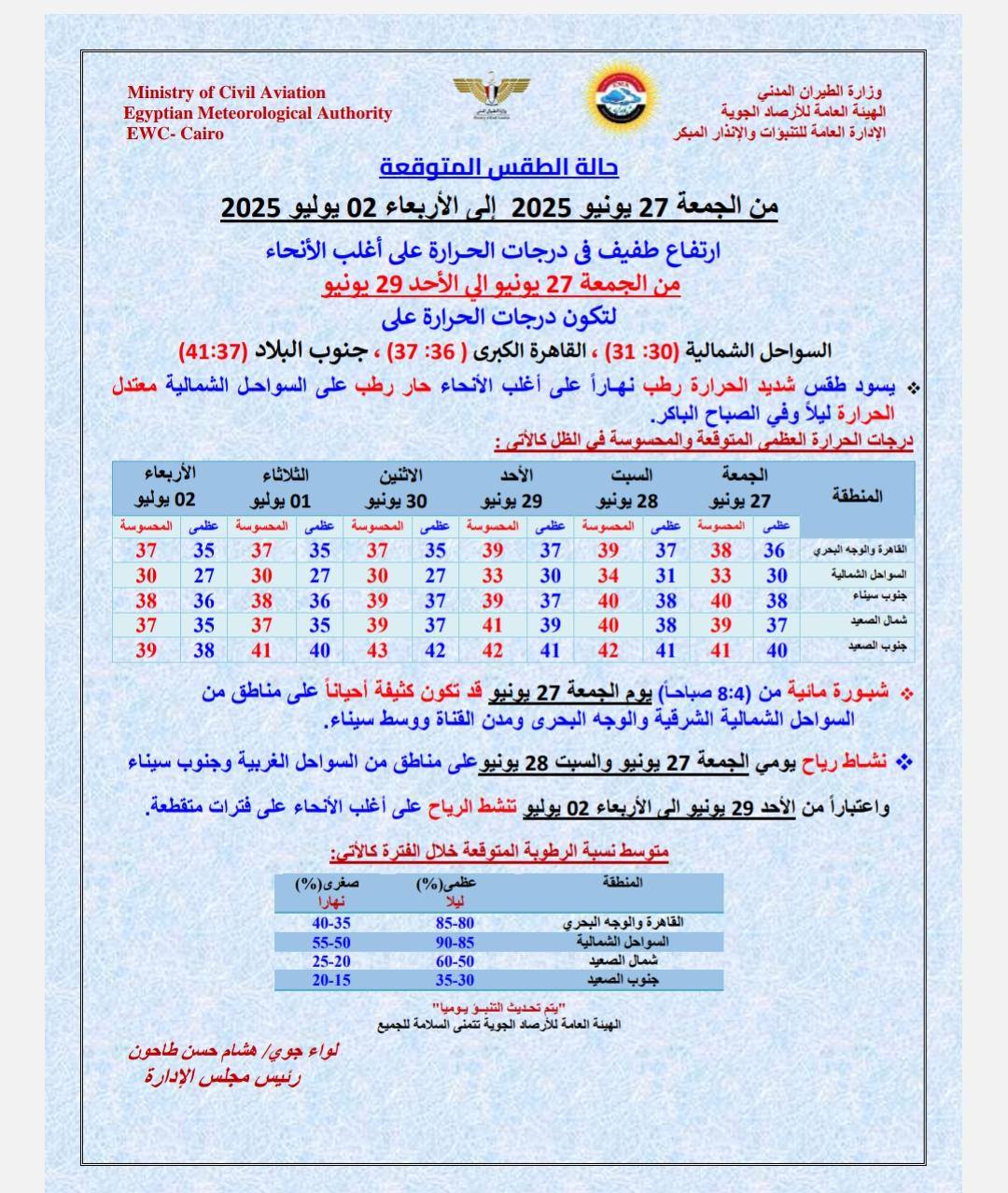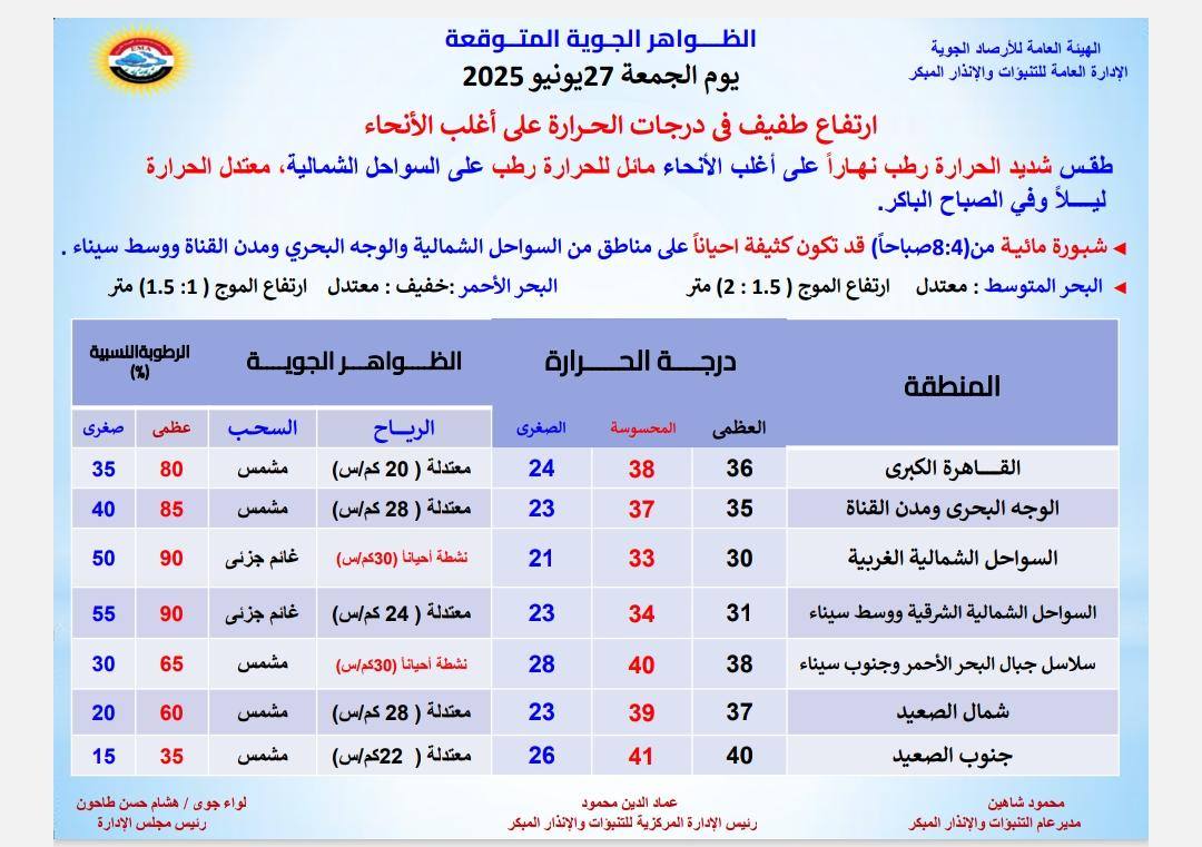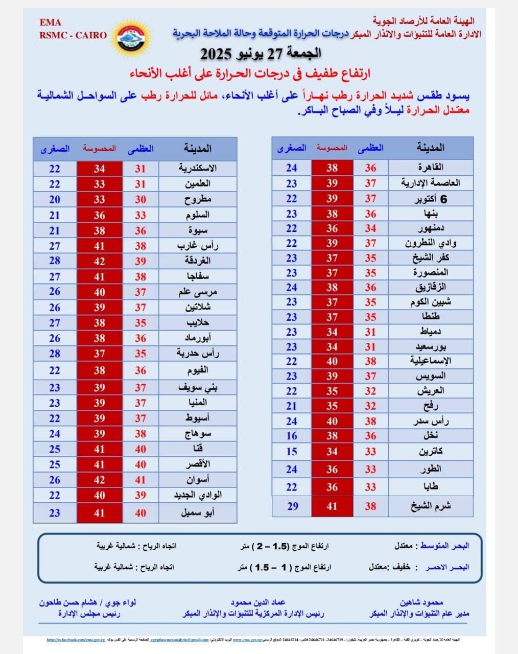 درجات الحرارة المتوقعة اليوم الجمعة 27 يونيو