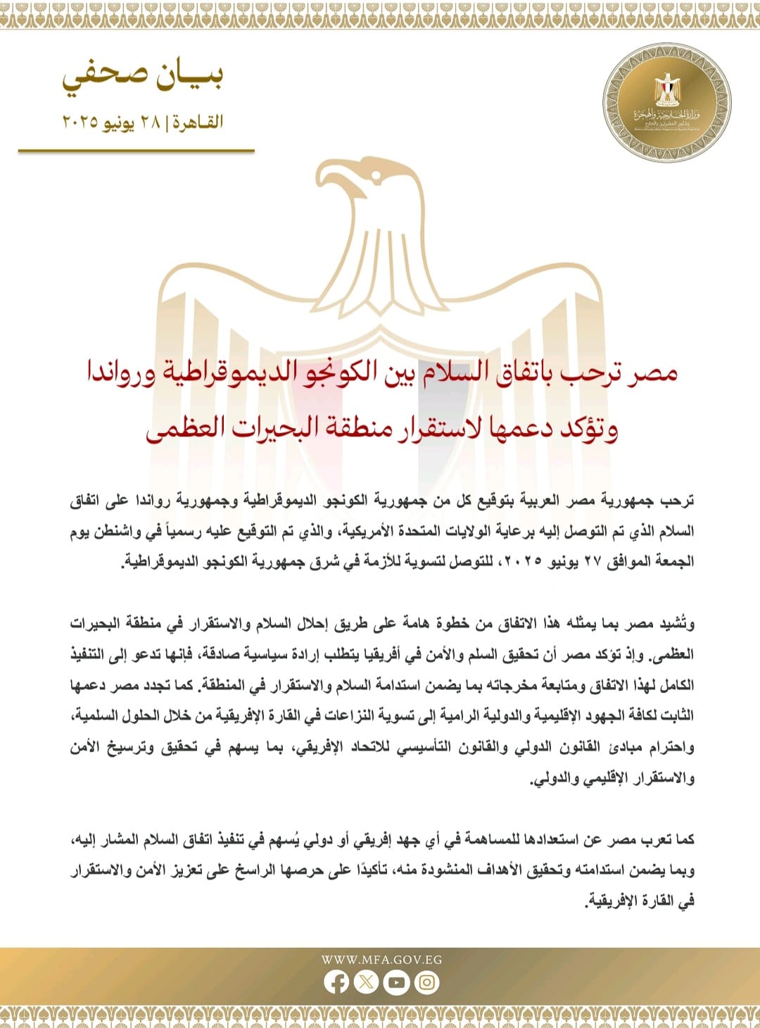 ترحب جمهورية مصر العربية بتوقيع كل من جمهورية الكونجو الديموقراطية وجمهورية رواندا على اتفاق السلام الذي تم التوصل إليه برعاية الولايات المتحدة الأمريكية، والذي تم التوقيع عليه رسمياً في واشنطن يوم الجمعة الموافق ۲۷ يونيو ۲۰۲۰ ، للتوصل لتسوية للأزمة في شرق جمهورية الكونجو الديموقراطية.