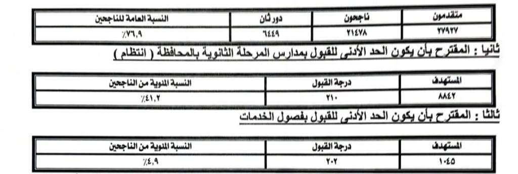 وتقررأن يكون الحد الأدنى للقبول بمدارس التعليم الثانوى العام 210 درجات ، كما سيكون الحد الأدنى للقبول بالثانوى العام للخدمات 202 درجة.