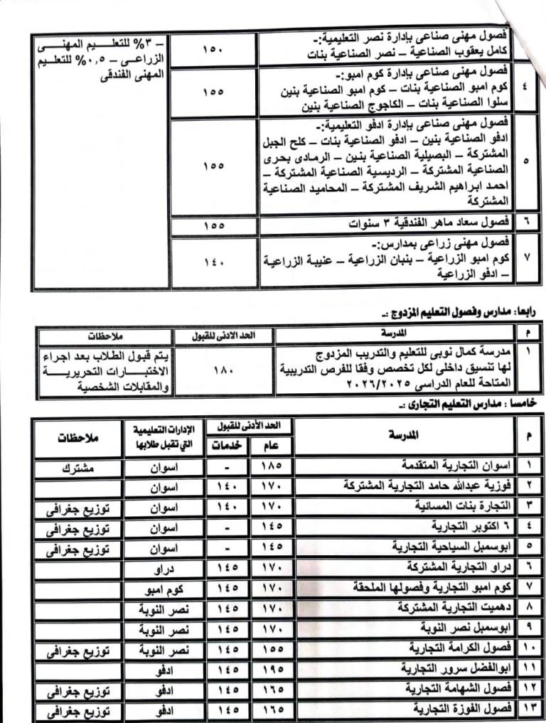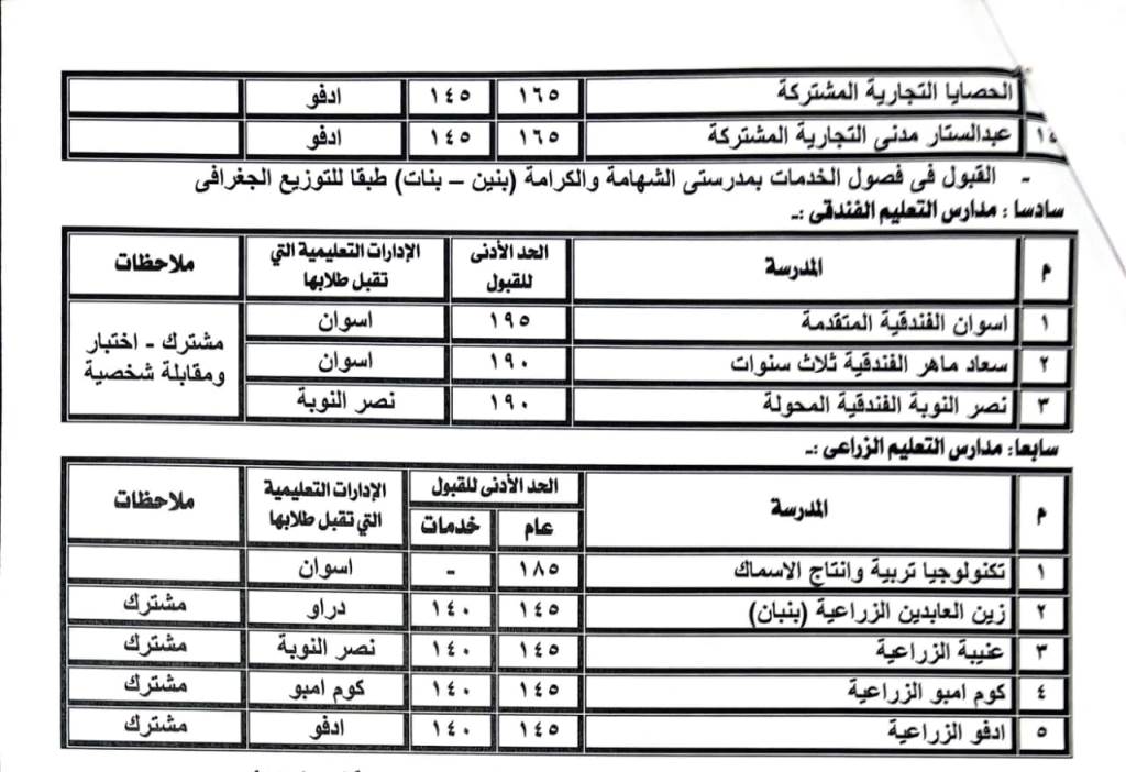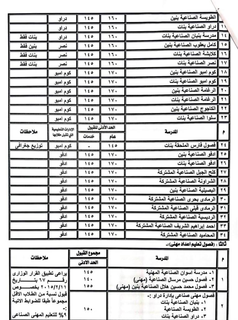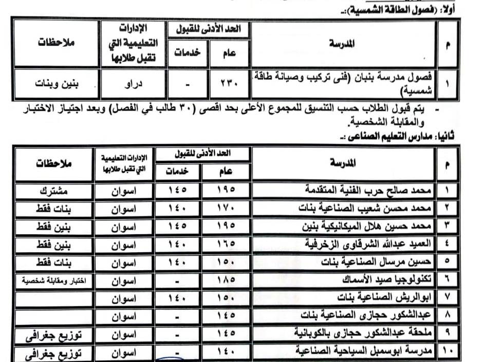فى حين يتراوح الحد الأدنى للقبول بمدارس التعليم الفنى والمهنى والخدمات فنى ما بين 140 درجة إلى 230 درجة حسب نوعية المدرسة ونظام الدراسة بها.