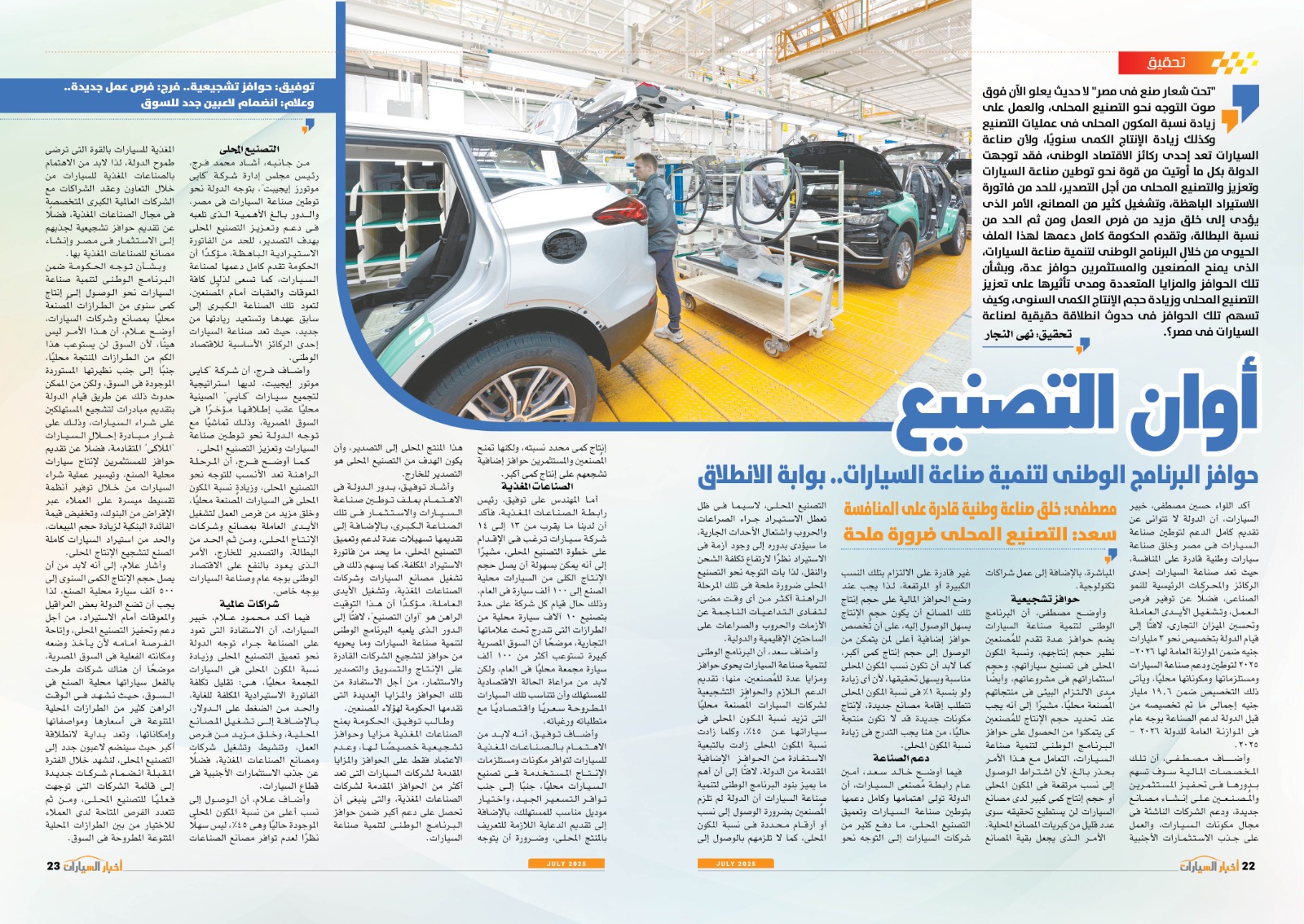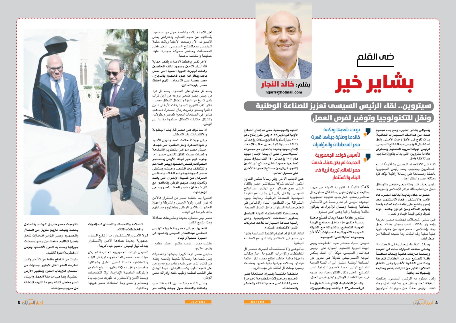 البداية مع مقال الكاتب الصحفي خالد النجار رئيس تحرير "أخبار السيارات" الذي جاء بعنوان "بشاير خير"، حيث أكد أنه مع بدء تجميع عدد من علامات السيارات العالمية، بدأت تلوح فى الأفق زخات الأمل.. ولعل استقبال الرئيس عبدالفتاح السيسى، لرئيس الهيئة العربية للتصنيع، ومسئولى علامة ستروين، التى بدأت باكورة إنتاجها، رسالة ثقة وأمل.. ثقة فى الاقتصاد المصرى وتأكيدًا لدعم المستثمرين وجذبهم، يقف رئيس الجمهورية داعمًا ومساندًا فى رسالة راقية تؤكد قوة ومتانة مصر واستقرارها.
