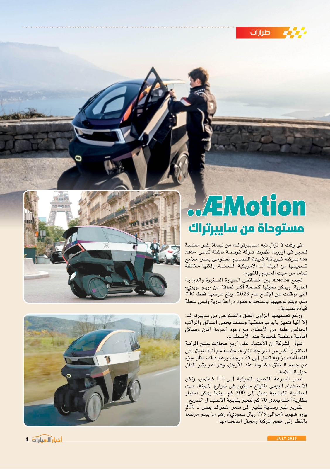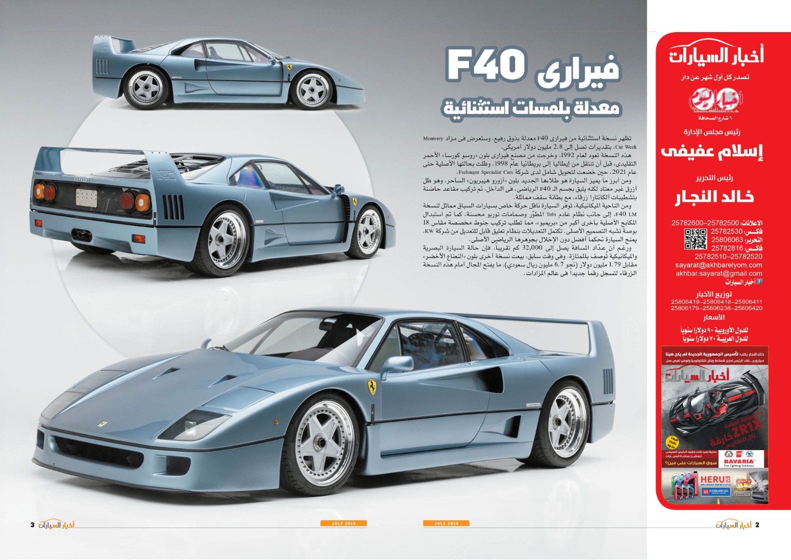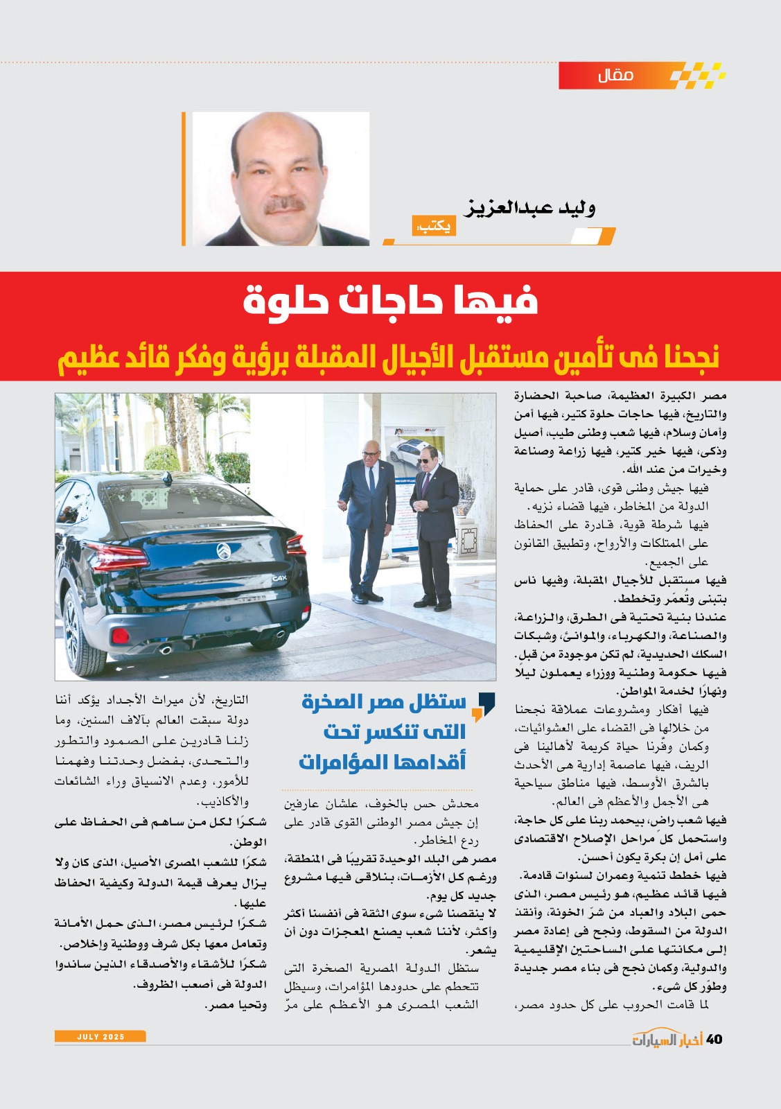 كما ضم العدد تقارير مشوقة منها N°8 الكهربائية.. بقوة 350 حصان، ÆMotion.. مستوحاة من سايبرتراك، فيراري F40.. معدلة بلمسات استثنائية، شيفرولية كورفيت ZR1X.. خارقة بكل المقاييس، توصيات مهمة في ختام مؤتمر أخبار اليوم العقاري، كيا PV5 Passenger.. الخيار الأفضل للعائلات، بدء التحول إلى النقل النظيف وخطة وطنية لاستبدال التاكسي بسيارات كهربائية، تصنيع قطع غيار السيارات بتقنيات الطباعة ثلاثية الأبعاد والماكينات الرقمية، نيسان Z9.. تصميم قوي وتقنيات متقدمة، أوان التصنيع، Galaxy A7 من جيلي.. فخامة لأبعد الحدود، تأثير تحت السيطرة.. تداعيات محدودة لحرب إسرائيل وإيران، 15 خطوة تضمن سلامة سيارتك في فصل الصيف، كما يحتوي العدد على حوار مع علاء حواش، المدير التنفيذي لشركة HERU، وكتب الكاتب الصحفي وليد عبدالعزيز مقالا بعنوان "فيها حاجات حلوة"، كما كتب الكاتب الصحفي عثمان علام مقالا بعنوان "سوق السيارات على فين".