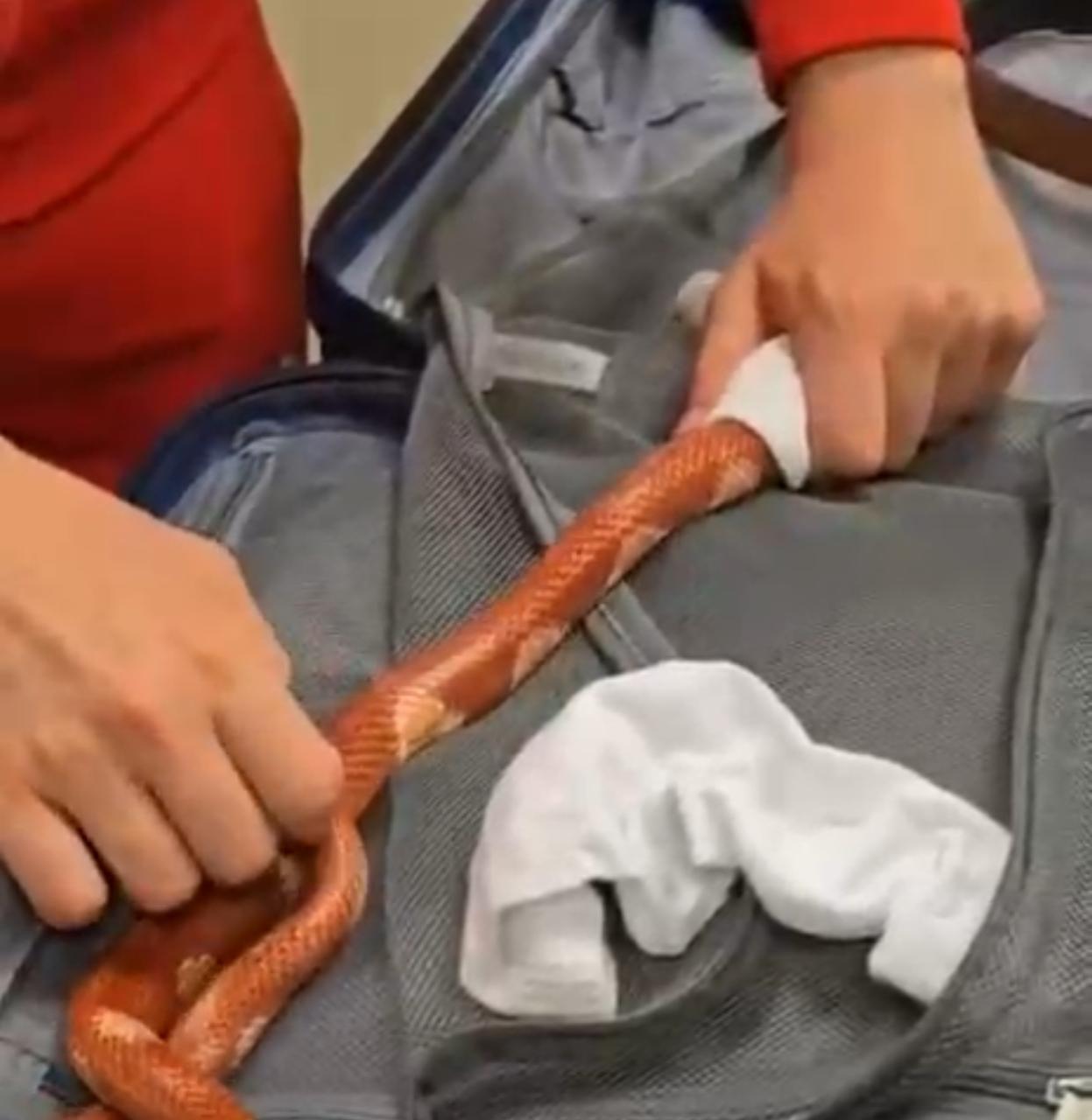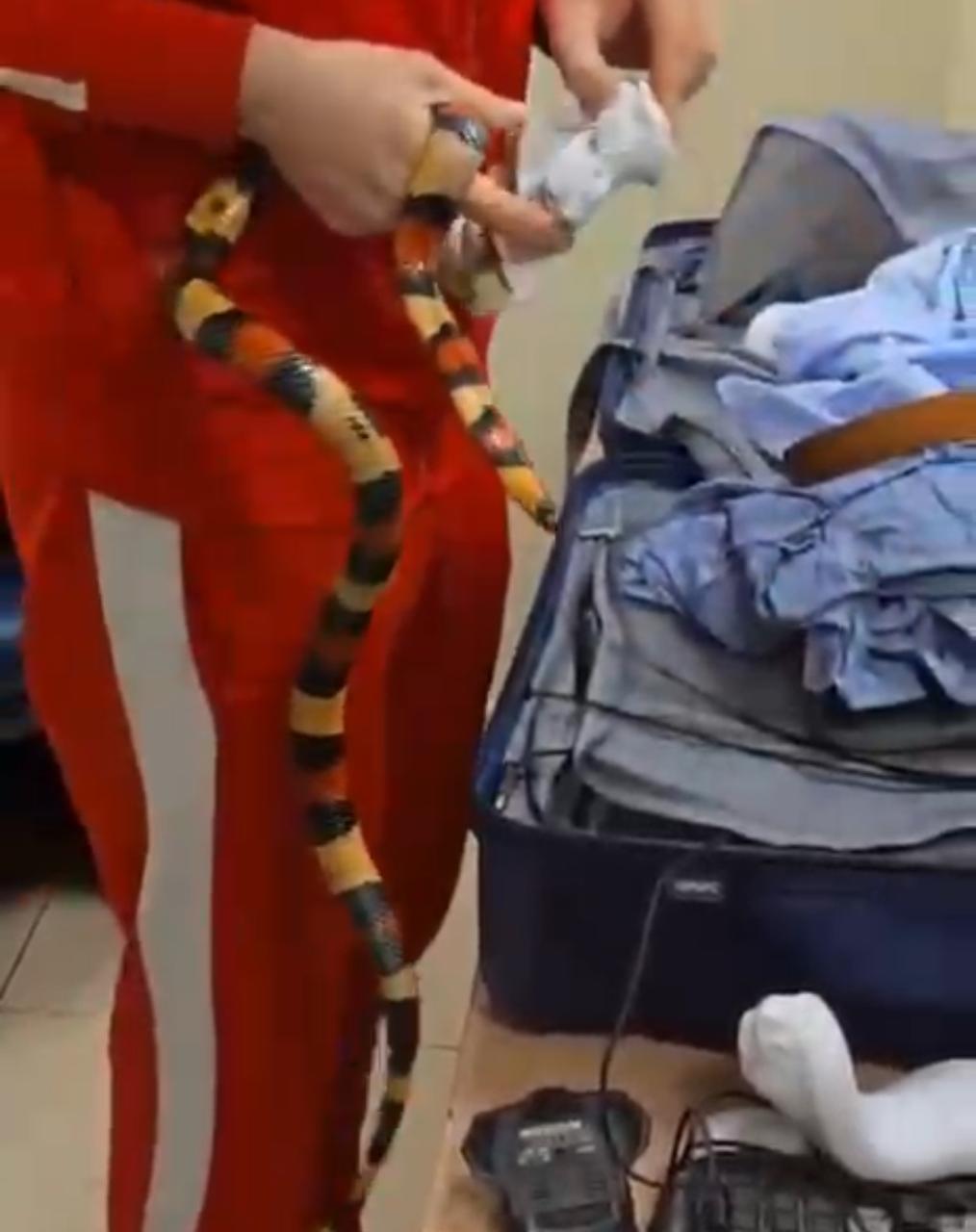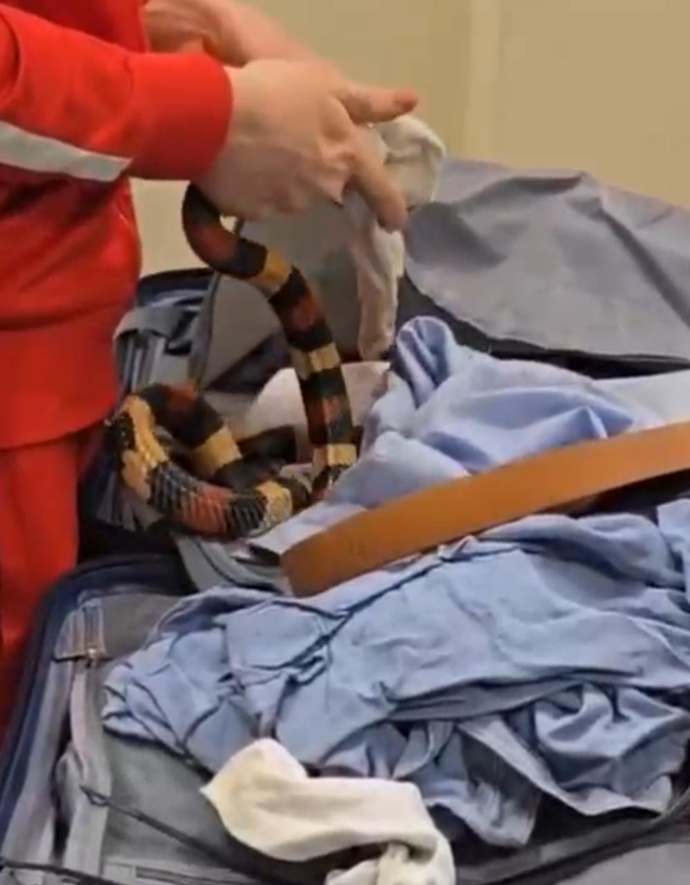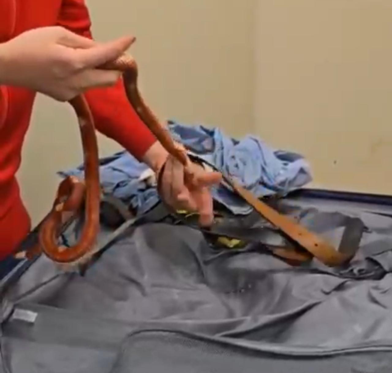 ففي اثناء انهاء الإجراءات الجمركية علي ركاب رحلة الخطوط الروسية (ايروفلوت) استوقف رئيس القسم المعين علي لجنة الخط الأخضر احد الركاب اثناء محاولته الخروج من بوابة اللجنة الجمركية، والذي انكر حوزته لما يجب الإفصاح عنه، وبتفتيش حقائب الراكب علي جهاز الفحص بالأشعة تلاحظ وجود كثافات عضوية داخل حقائب الراكب وبتفتيش حقائب الراكب يدويا عثر علي ثعابين وعقارب داخل الحقائب.