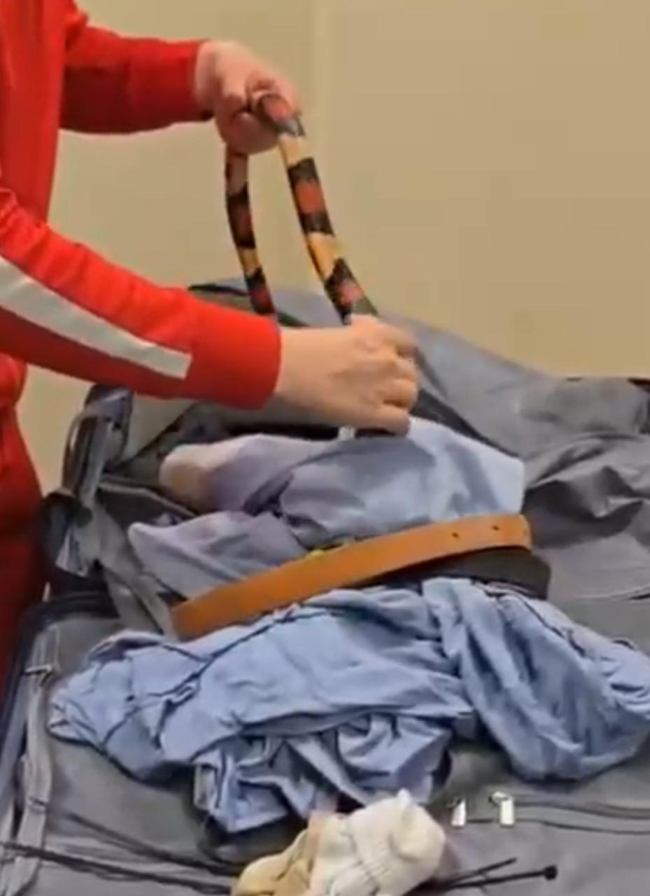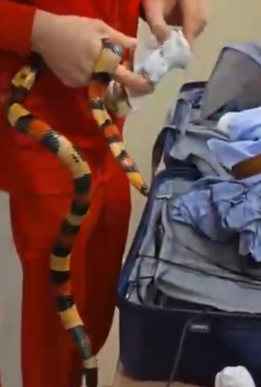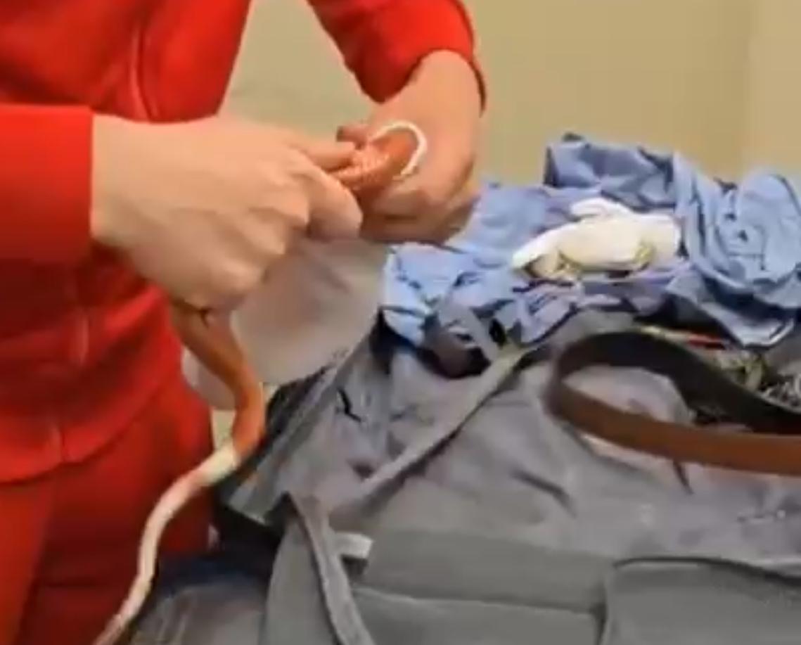 ففي اثناء انهاء الإجراءات الجمركية علي ركاب رحلة الخطوط الروسية (ايروفلوت) استوقف رئيس القسم المعين علي لجنة الخط الأخضر احد الركاب اثناء محاولته الخروج من بوابة اللجنة الجمركية، والذي انكر حوزته لما يجب الإفصاح عنه، وبتفتيش حقائب الراكب علي جهاز الفحص بالأشعة تلاحظ وجود كثافات عضوية داخل حقائب الراكب وبتفتيش حقائب الراكب يدويا عثر علي ثعابين وعقارب داخل الحقائب.
